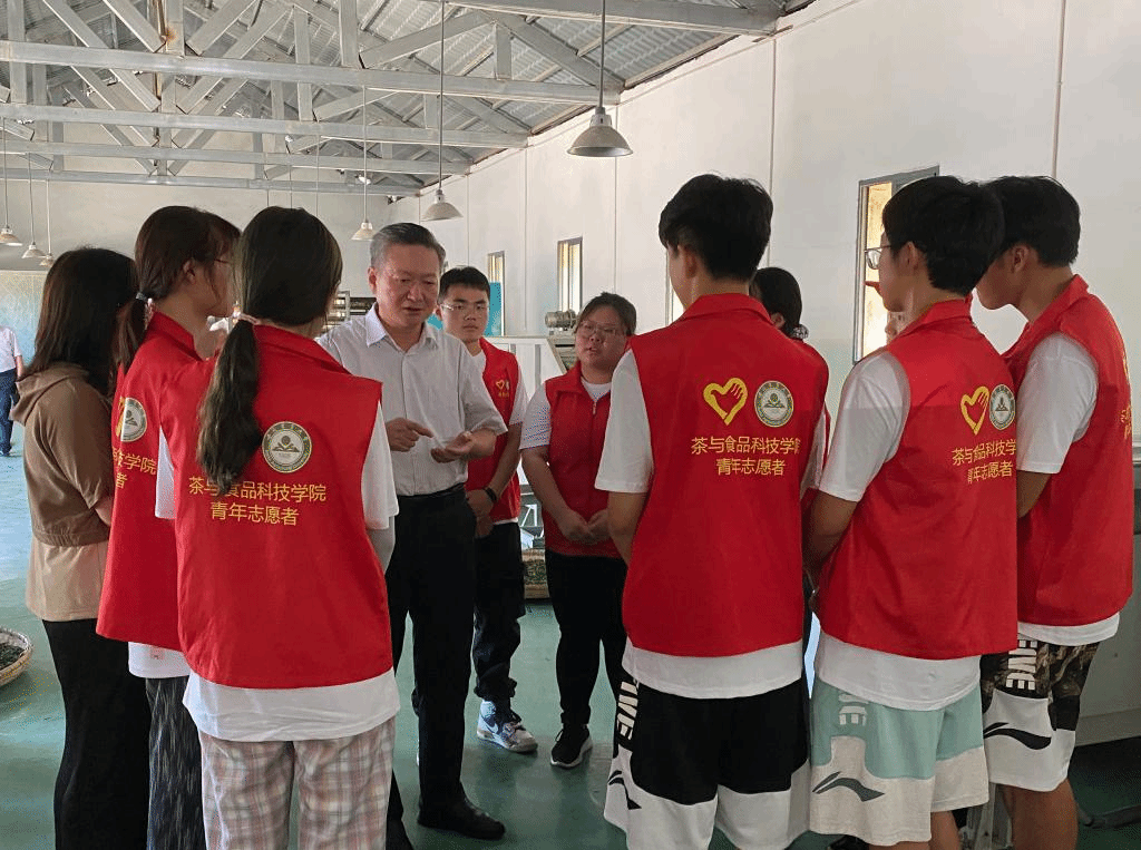 江春一行首先慰问了正在大畈村开展党史宣讲的信息与计算机学院的师生,并与他们亲切交谈;希望同学们要认真学好党的百年历史,面向基层群众积极开展互动式、有特色、接地气的宣讲活动,讲好党的故事,传播党的声音。随后,江春一行来到大畈村老茶,同正在指导炒制夏秋茶的茶与食品科技学院的师生们进行了亲切交流,详细了解活动开展情况;勉励师生们发挥我校茶学学科专业优势,指导好茶企充分利用好夏秋茶资源,做强做优茶产业,为大畈村产业振兴做出积极贡献。