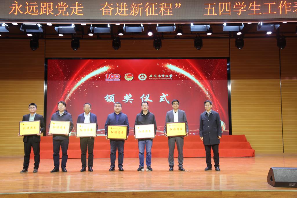 本网讯 4月28日下午,我校在欣苑四楼学生活动中心举办“喜迎二十大 永远跟党走 奋进新征程”2022年“五四”学生工作表彰大会。校领导裴树东、李红、马传喜、操海群,党政办、组织部、宣传部、教务处、研工部、学工部、招就处、团委等单位负责人出席大会并颁奖,各学院党委副书记、团委负责老师,以及受表彰师生代表现场参加大会,各学院团员代表线上收看。