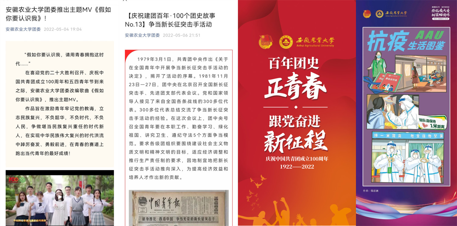 “假如你要认识我,请用青春拥抱这时代”,“五四”期间,校团委推出主题MV《假如你要认识我》,中华全国学联、安徽共青团纷纷转载。校团委梳理共青团跟党奋斗百年运动历史脉络,举办“青春心向党,建功新时代”主题图片展览,通过一份份档案、一张张旧照,展现共青团发展历史轨迹和安农青年的青春担当。“绘抗疫大爱,树家园情怀”插画艺术大赛,团员青年以艺术绘画描摹疫情防控下的感人事迹。团属新媒体开设“100个团史故事”专栏,制作推出“榜样力量”系列采访,宣传优秀青年典型事迹。“我的入团故事”“微团课”视频征集大赛……青年学子深情抒发爱党爱国热情。丰富多彩的主题文化产品,为青年提供了精神滋养,为“喜迎二十大”营造了浓厚氛围。