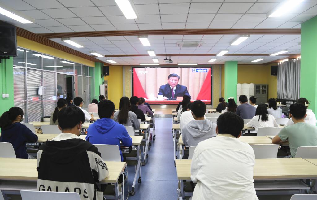 校团委全体工作人员、学生会等校级学生组织负责同学、研支团成员、校级青马班代表等在创客空间A区路演大厅收看大会直播。各二级学院团委通过电视直播、网络视频,广泛组织青年师生观看大会实况。