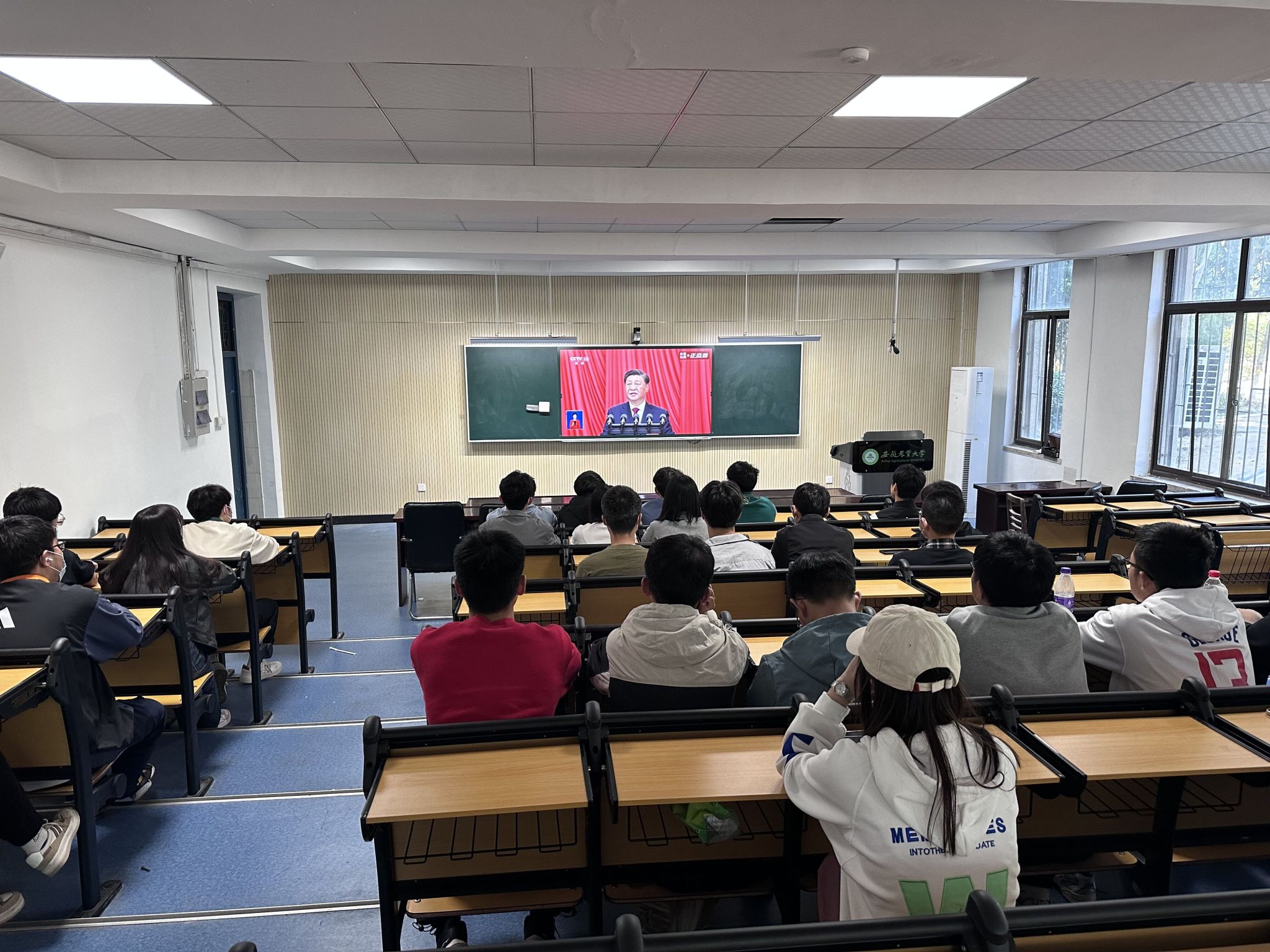 在工学院101教室,工学院学生分会负责人带领各部门部长和干事一起收听收看开幕会直播,聚精会神地聆听习近平总书记所作的报告。