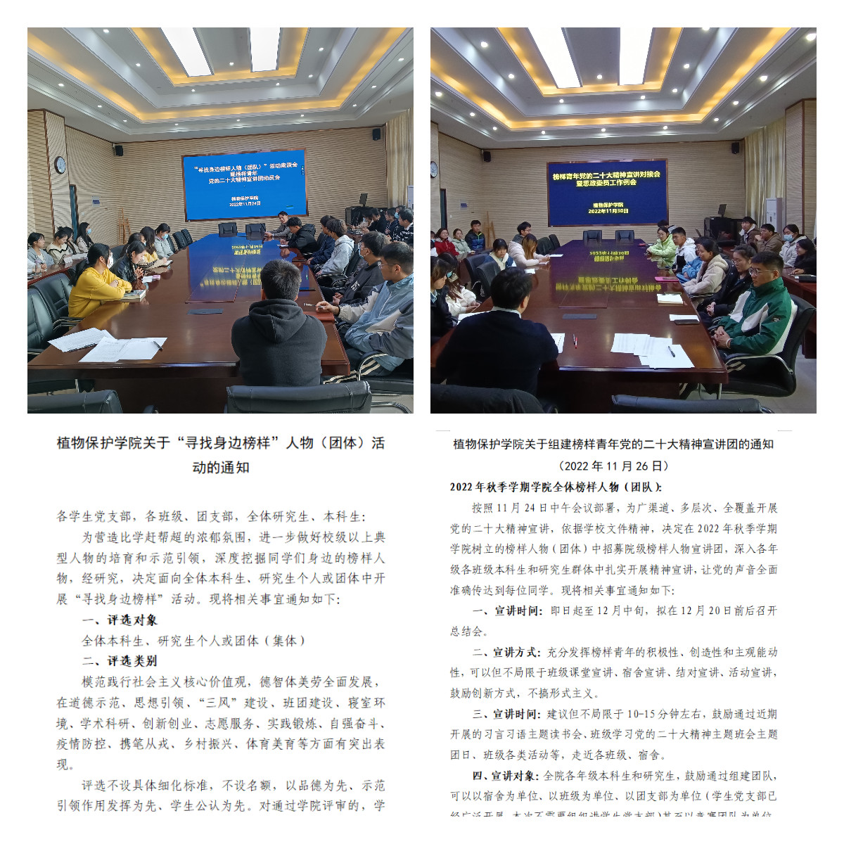 本网讯 为广渠道、多层次、全覆盖开展党的二十大精神宣讲,依据学校文件精神,植物保护学院在前期树立的榜样人物(团体)中遴选组建院级青春榜样宣讲团,深入各年级各班级本科生和研究生群体中扎实开展党的二十大精神宣讲,让党的声音全面准确传达到每位同学。