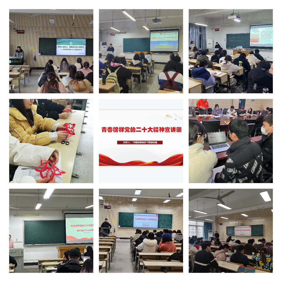 精心组织,让精神成为示范的指引。宣讲团成员充分发挥榜样青年的积极性、创造性和主观能动性,并结合自身所学所思所感所悟,将党的二十大报告中的部分章节进行了深入挖掘和细致思考,宣讲团成员通过与班级思政委员对接,提前安排,全心组织,利用课后十分钟、考试后的空余时间进入班级。活动期间,各成员确定从党的二十大报告基本知识、学习手账、全过程人民民主专题、中国三大战略和生态文明建设理念、英雄先进模范事迹、并结合党的二十大知识问答、植保青年怎么做、中国传统剪纸文化、学习党的二十大精神主题班会主题团日、班级各类活动等诸多内容、各个方面,运用同学们喜闻乐见的方式进行宣讲和引导,赢得了学生的广泛好评。
