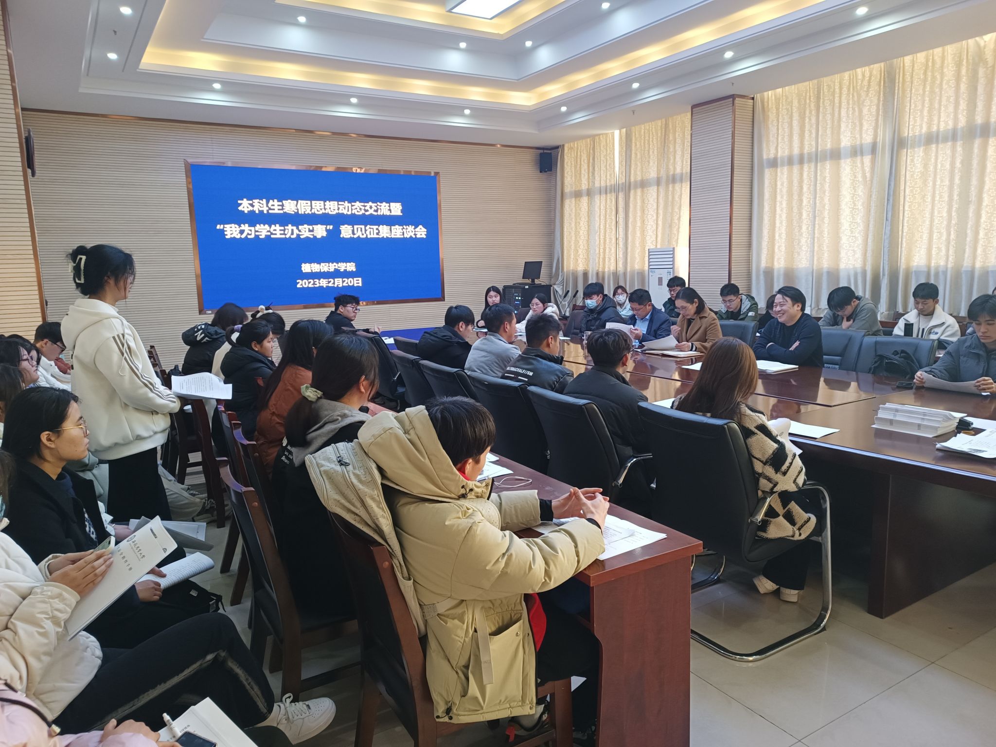 聚焦办实事,广渠道收集意见建议。学校印发“我为学生办实事”意见征集通知后,学院领导班子带头落实“一线工作法”,在学生开学报到当日深入各年级学生宿舍走访,开展了“1+2+N”新学期第一期植保夜话。在“开学窗口期”,于20-21日相继召开本科生和研究生寒假思想动态调研暨“我为学生办实事”意见征集座谈交流会,同时面向全体同学发布调查问卷,广渠道面对面听取学生思想动态,一一回应反映的困难问题。