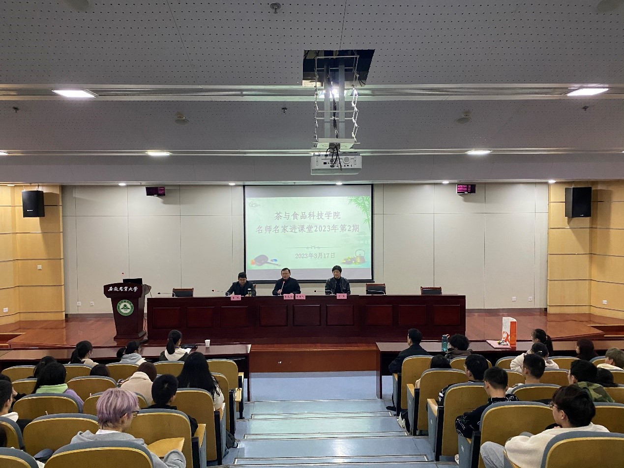 本网讯 3月17日下午,茶与食品科技学院在图书馆第二报告厅举办2023年第2期“名师名家进课堂”专题活动,广东壹零捌茶业科技有限公司首席执行官罗军和西黄山茶叶实业有限公司总经理童城校友应邀授课。两位为同学们做了《新茶饮的中国形势以及茶叶风味应用》、《新时期大学生职业能力培养路径和茶产业发展趋势》的精彩报告,学院150多名师生到场聆听了报告,报告会由院长李大祥主持。