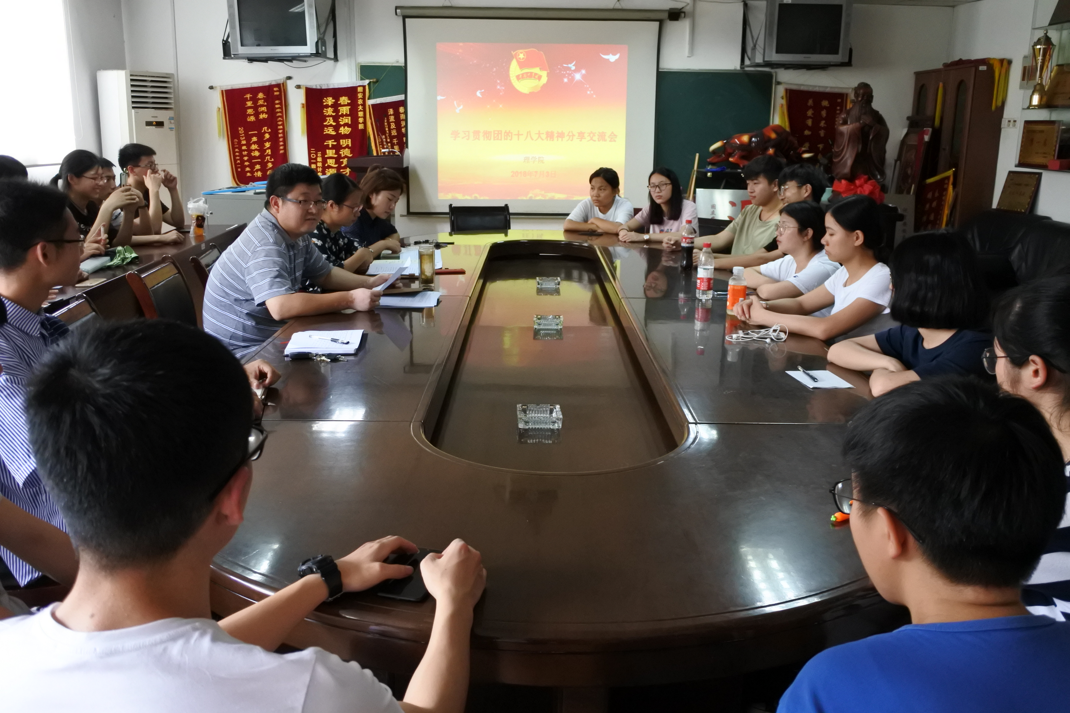 本网讯 7月3日中午,理学院在二教会议室召开学习分享会,深入学习宣传贯彻共青团第十八次全国代表大会精神。院党委副书记、副院长韩弥明,团委老师及各班团支部书记、优秀团员代表参加了会议。