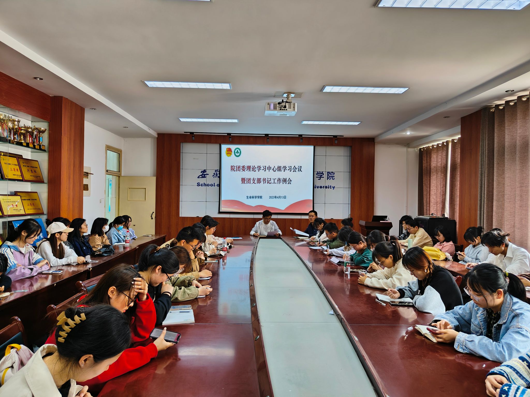 本网讯 4月13日中午,生命科学学院在十教418会议室召开院团委理论学习中心组学习会暨团支部书记工作例会,学院团委理论中心组全体成员、本硕各班级团支部书记、学生会团工部全体成员参加会议,会议由院团委副书记主持。