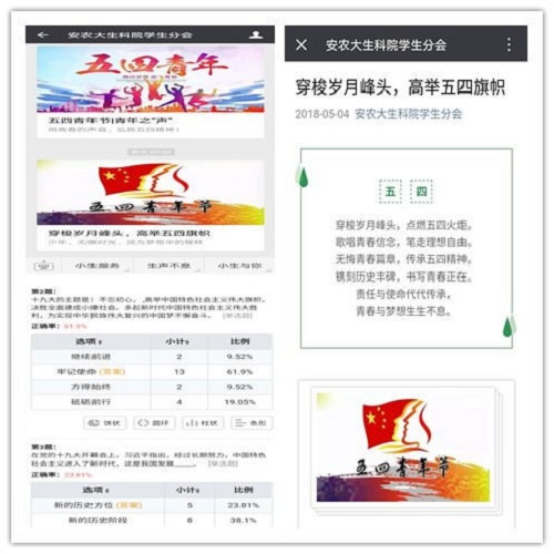 除此之外,学院团委还利用微信、QQ、微博等网络平台积极推送“正当青年先锋”、“青年之‘声’”、“穿梭岁月峰头,高举五四旗帜”等五四青年节专题,引导学生不忘初心,肩负使命。