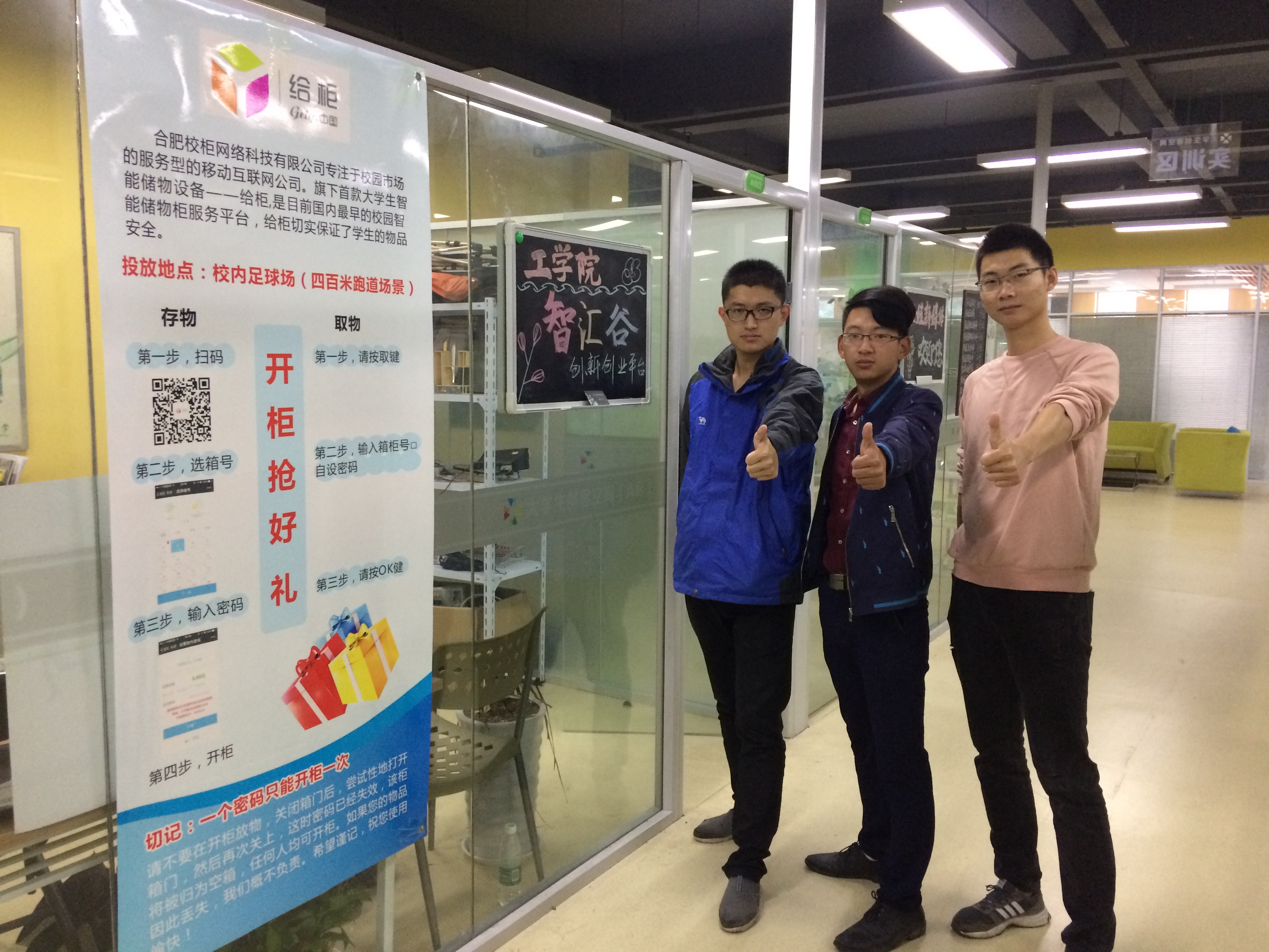 2016年10月,经学院推荐,工学院智汇谷创新创业团队入驻校大学生创客空间A区002室,经过近半年时间的孵化,2017年4月,团队领头人2014级机械设计制造及自动化专业学生董雨乐,依托创客空间注册成立了合肥校柜网络科技有限公司。公司成立后,团队成员利用课余时间,在充分调研合肥高校智能储物柜安装情况、学生校园运动场地物品失窃情况的基础上,通过采取团队成员众筹的方式,在学校风足球操场安装了第一批智能储物柜,储物柜依托微信公众号平台,通过简单的扫码注册即可使用。