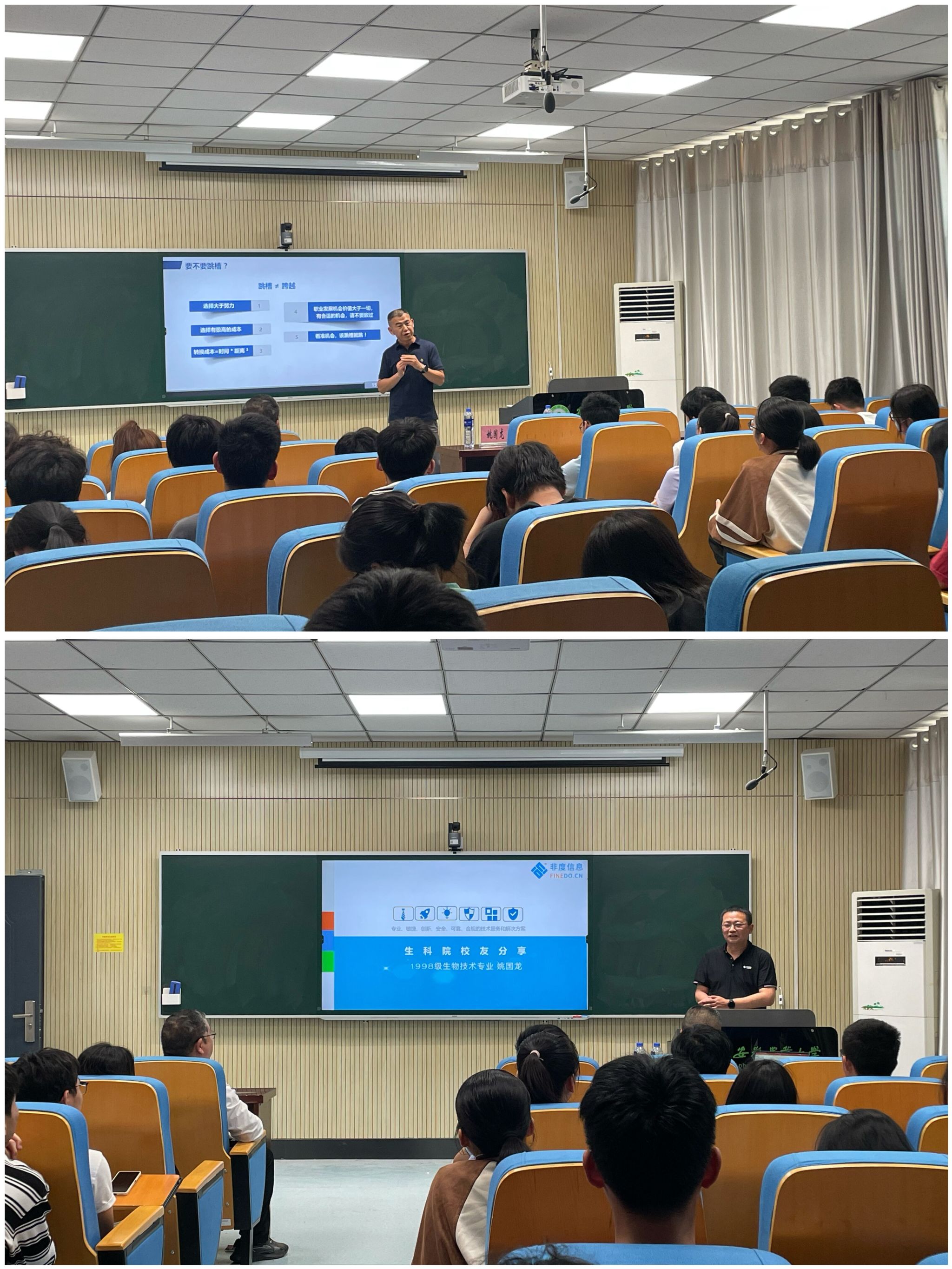 姚国龙校友围绕“团结 勤奋 求实 创新”校训,介绍了自己如何把握发展机遇,在行业内站稳脚跟的创业经历,并介绍了自主创业路上从生物技术专业到IT行业事业的跳转,从公司创立之初的盈利到自身价值实现再到社会责任的奋斗目标变化,为大学生上了一堂既生动又有借鉴意义的就业创业指导课。