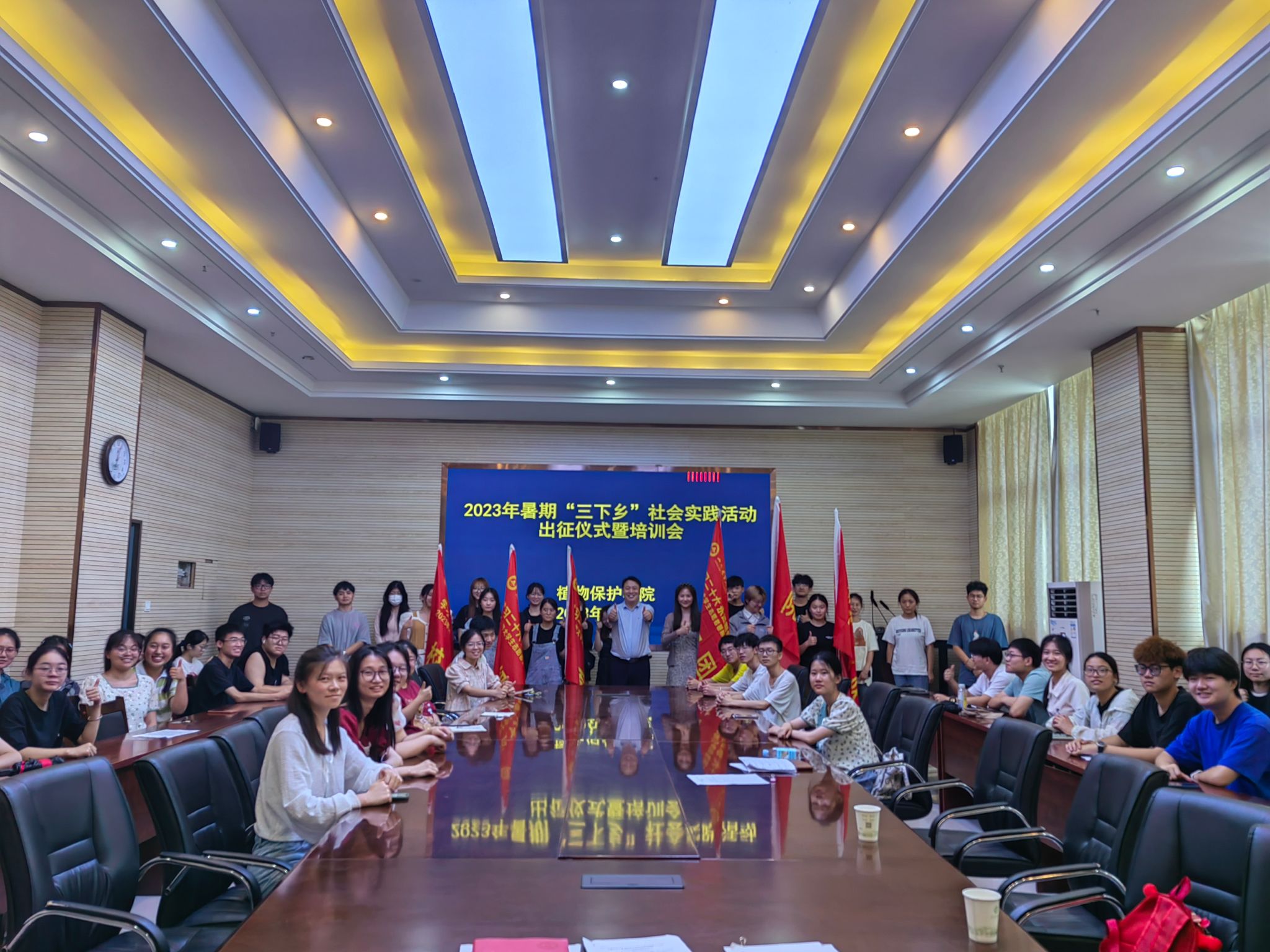 会议传达了学校培训会精神和要求,就实践调研、报告撰写等方面进行培训,并着重加强安全教育。随后,各团队依次汇报团队实践准备情况和日程安排。会后,学院还为各团队发放队旗队服,举行了授旗仪式。