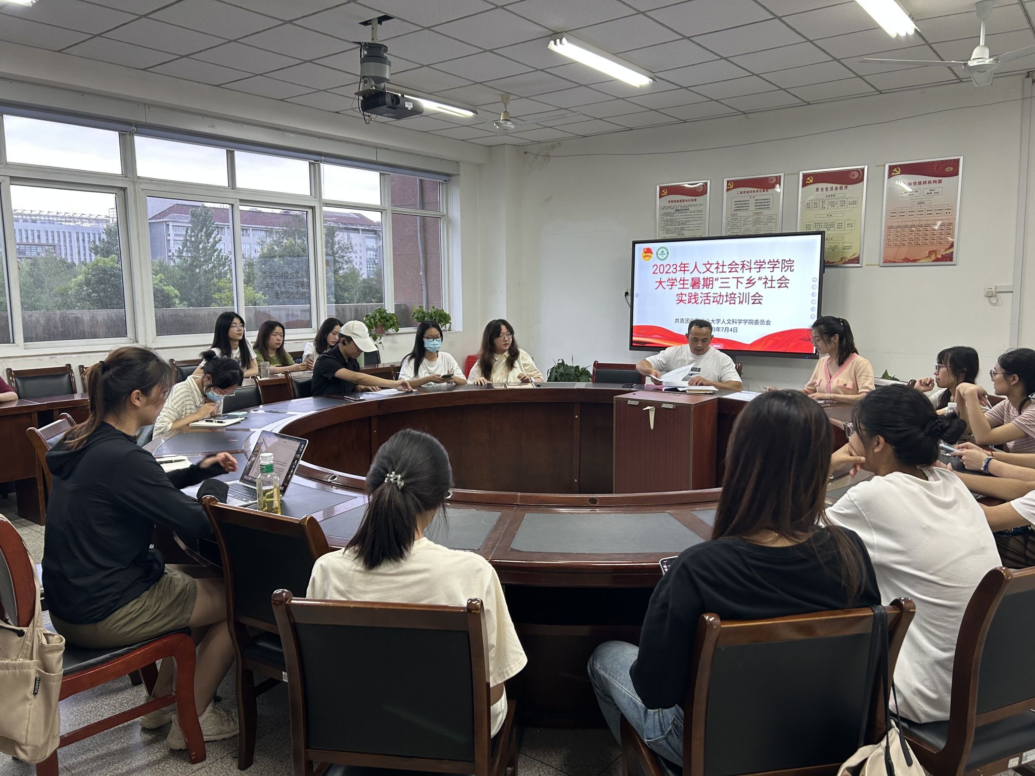 本网讯 为深入学习贯彻习近平新时代中国特色社会主义思想主题教育,全面贯彻落实党的二十大精神,7月4日中午,人文社会科学学院在人文楼204会议室开展暑期“三下乡”社会实践活动出征仪式暨培训会。学院团委工作负责人,团队成员参加出征仪式。