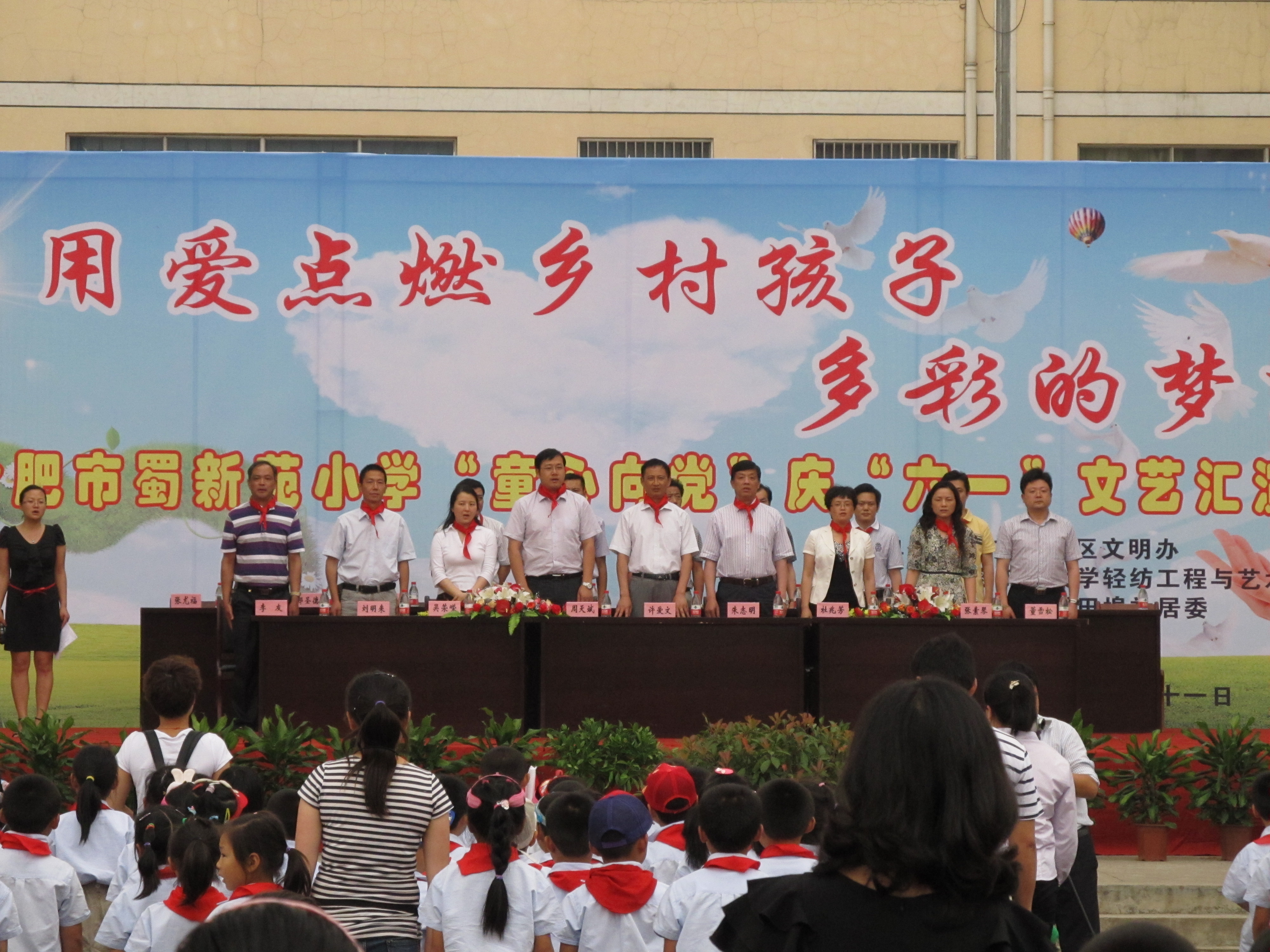 本网讯 5月31日下午,蜀山区文明办、轻纺工程与艺术学院、蜀山工业园和蜀新苑小学联合主办的“用爱点燃乡村孩子多彩的梦” 庆“六一”文艺汇演在蜀新苑小学隆重上演。合肥市文明办、合肥市教体局、蜀山区文明办、蜀山工业园和蜀新苑小学的负责同志出席开幕式,轻纺工程与艺术学院党委委员副院长杜兆芳教授、院长助理刘明来副教授、团委书记姚洪章同志出席开幕式,全程观看了文艺汇演,蜀新苑小学900余名学生及他们的家长参加了开幕式并观看演出。