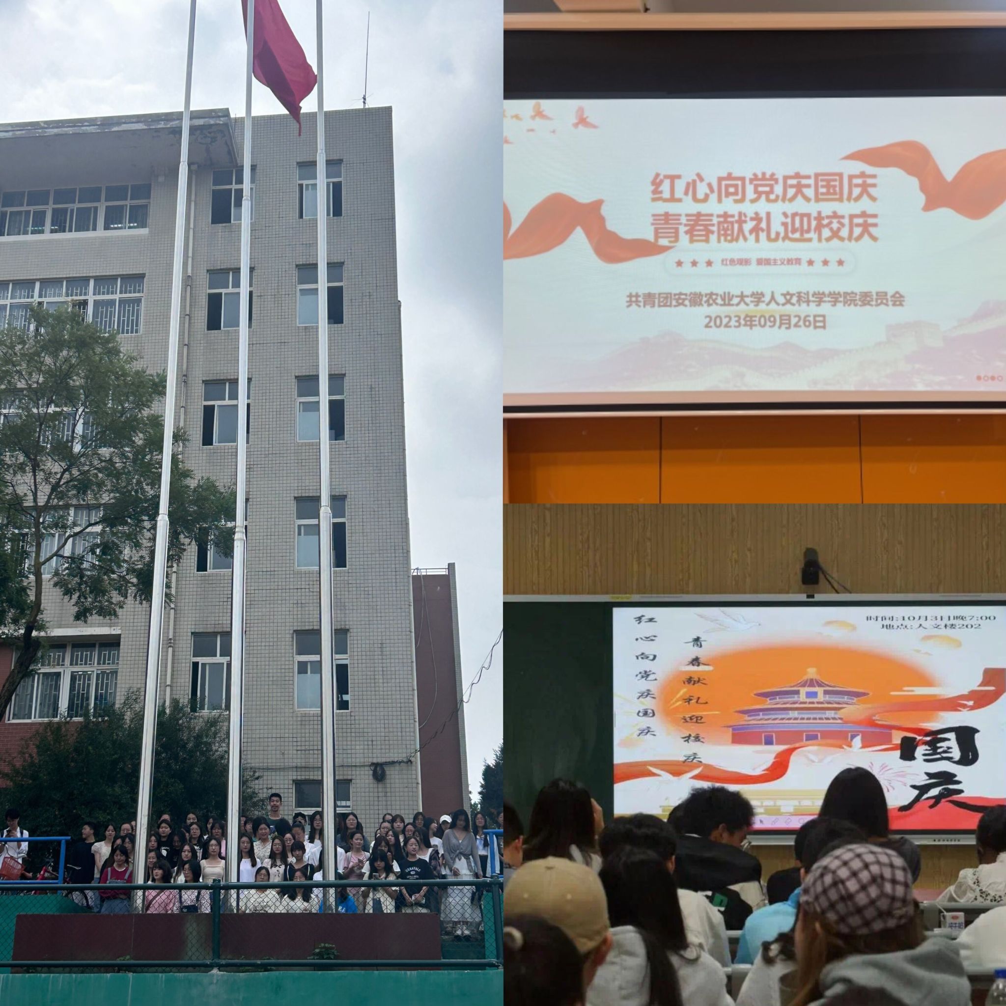 本网讯 金秋十月,丹桂飘香,适逢祖国74周年华诞,国庆期间,人文社会科学学院为贺迎95周年校庆,祝福祖国,组织开展了 “红心向党庆国庆 青春献礼迎校庆”主题团日活动,进一步加强了广大青年学子校史校情、爱校荣校教育,营造了喜迎校庆的浓厚氛围,激发了广大团员青年的向心力、凝聚力和自豪感。