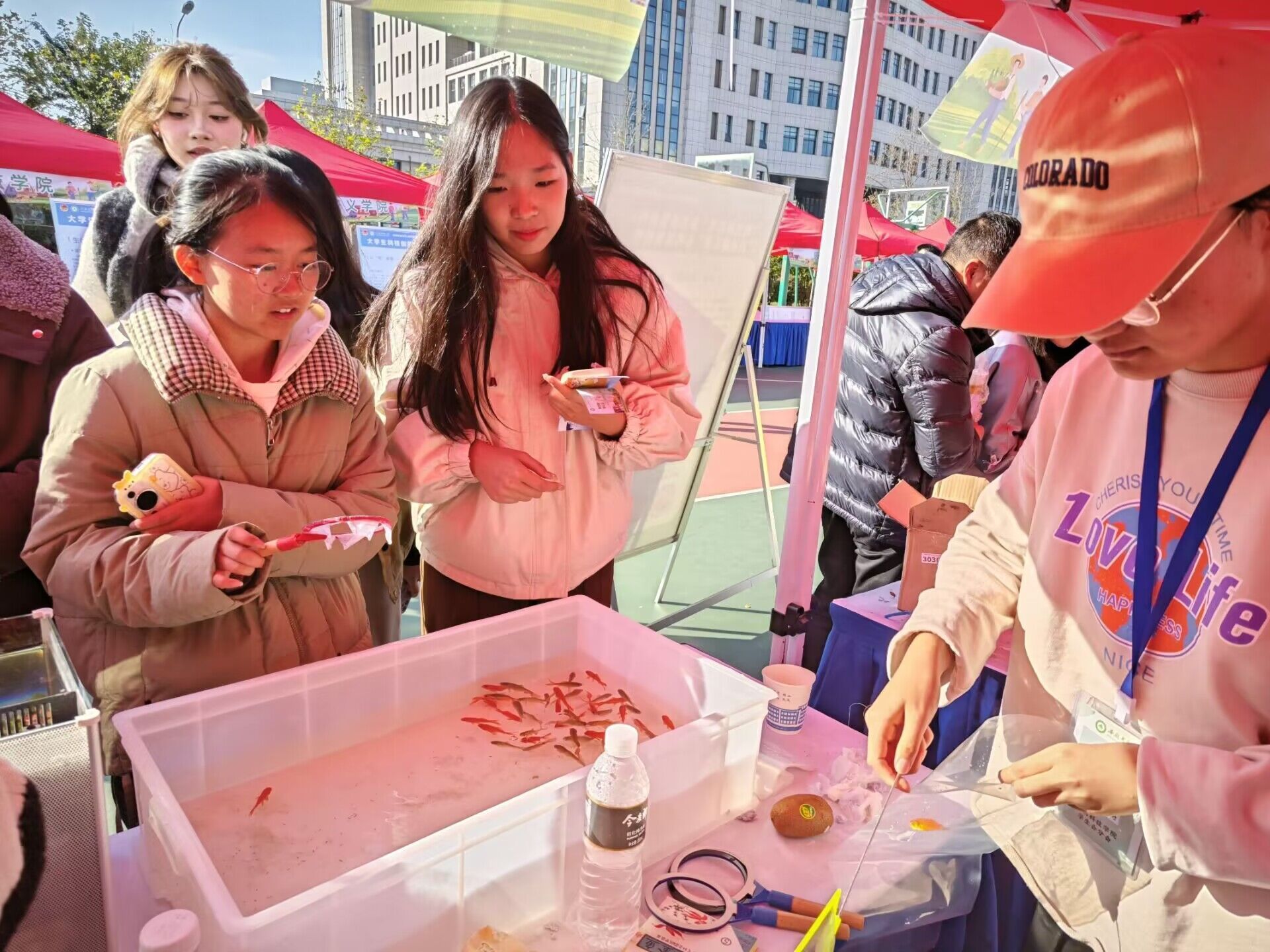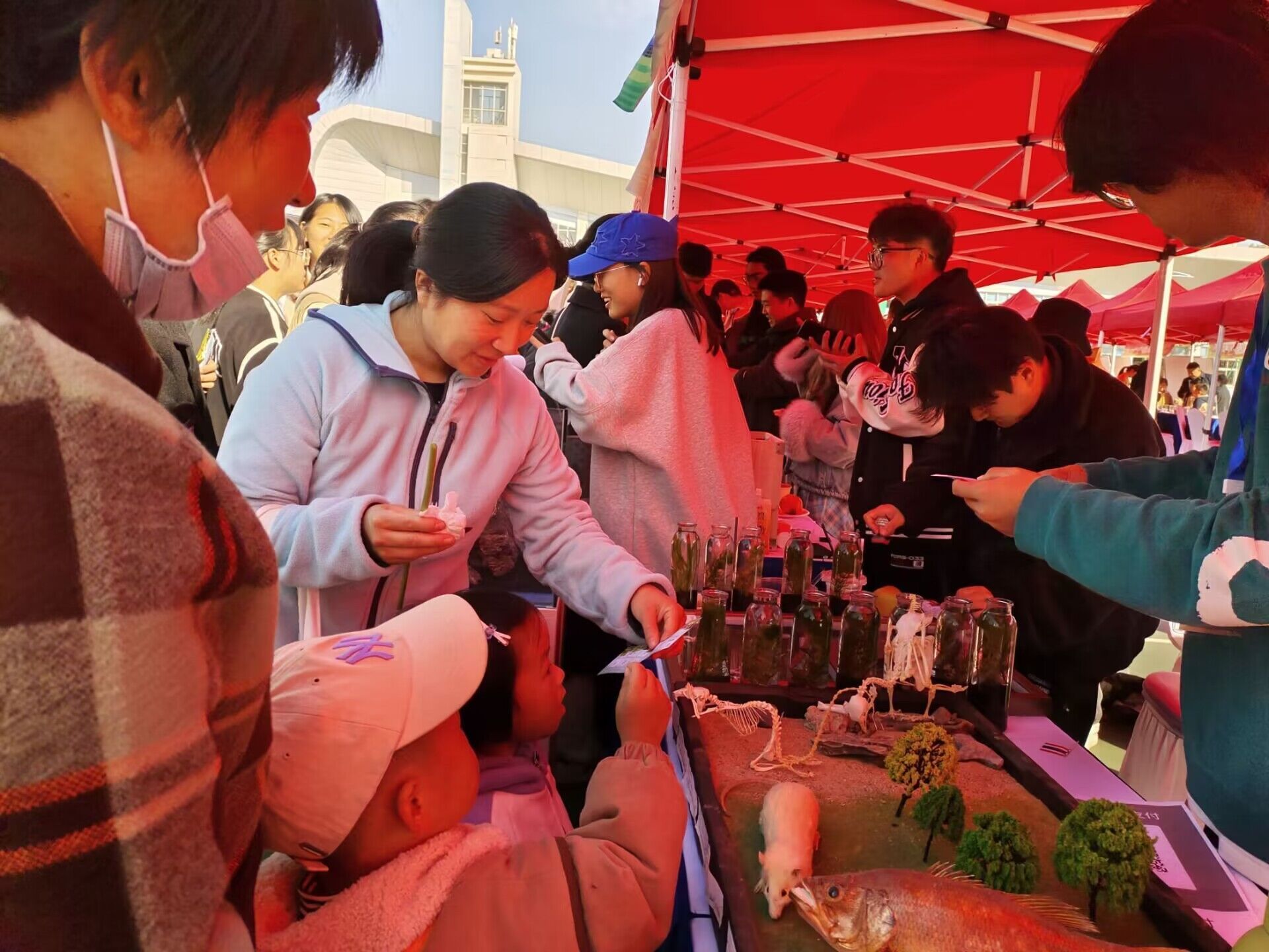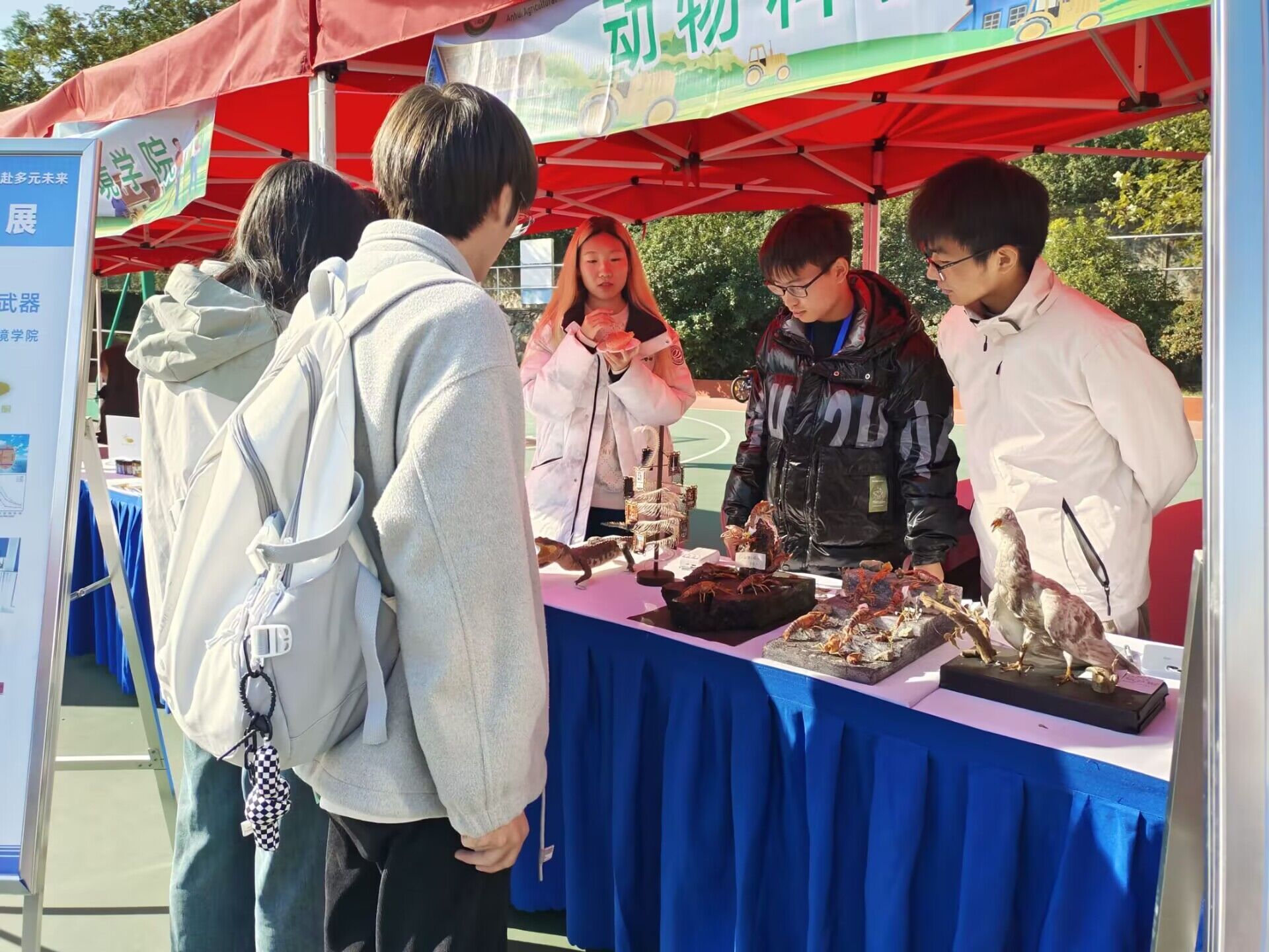 农耕文化节活动中,动物科技学院设置了成果展示类和互动体验类两大类区域。在成果展示区,各种各样的动物标本定格生命之美,“留住”动物世界的千姿百态,各式各样的生态瓶展现生态循环,表现生物和谐共存的美好。在互动体验区,同学们和教职工们积极参与知识问答,体验纸捞鱼的快乐。通过面对面的互动与交流,同学们在热烈的氛围中学习、了解更多的动物知识。
