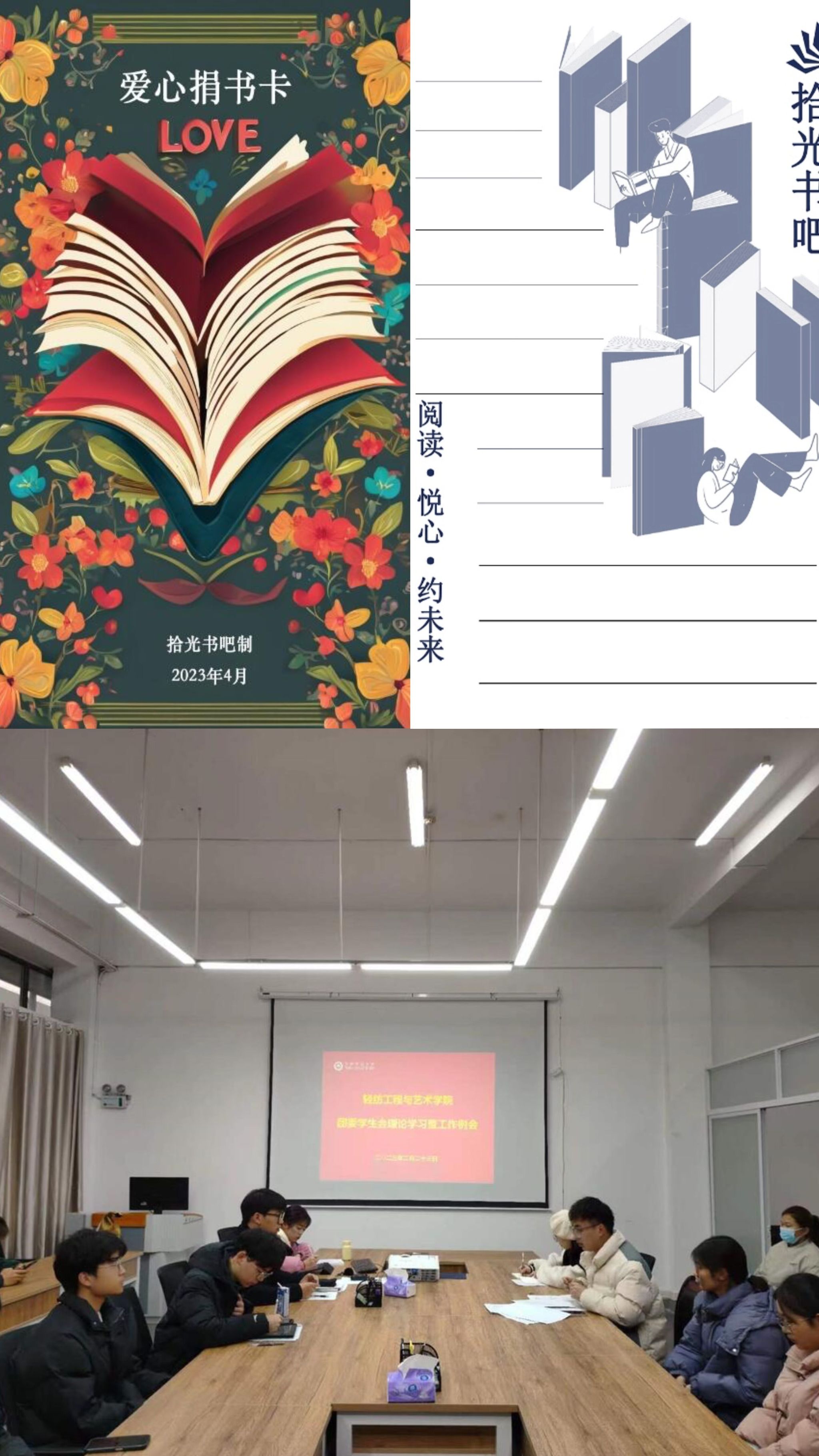 材料与化学学院团委组织各部门成员及学生代表在会上讨论并制定活动方案。由各班辅导员统一在班级支部上做动员,宣读倡议书,分发“爱心捐书卡”,通知学生按要求捐出自己的书籍,并填写“爱心捐书卡”。各院师生捐书志愿者均在我院分发的“爱心捐书卡”上填写学院、班级、姓名、捐书日期、捐书心愿和读书格言。