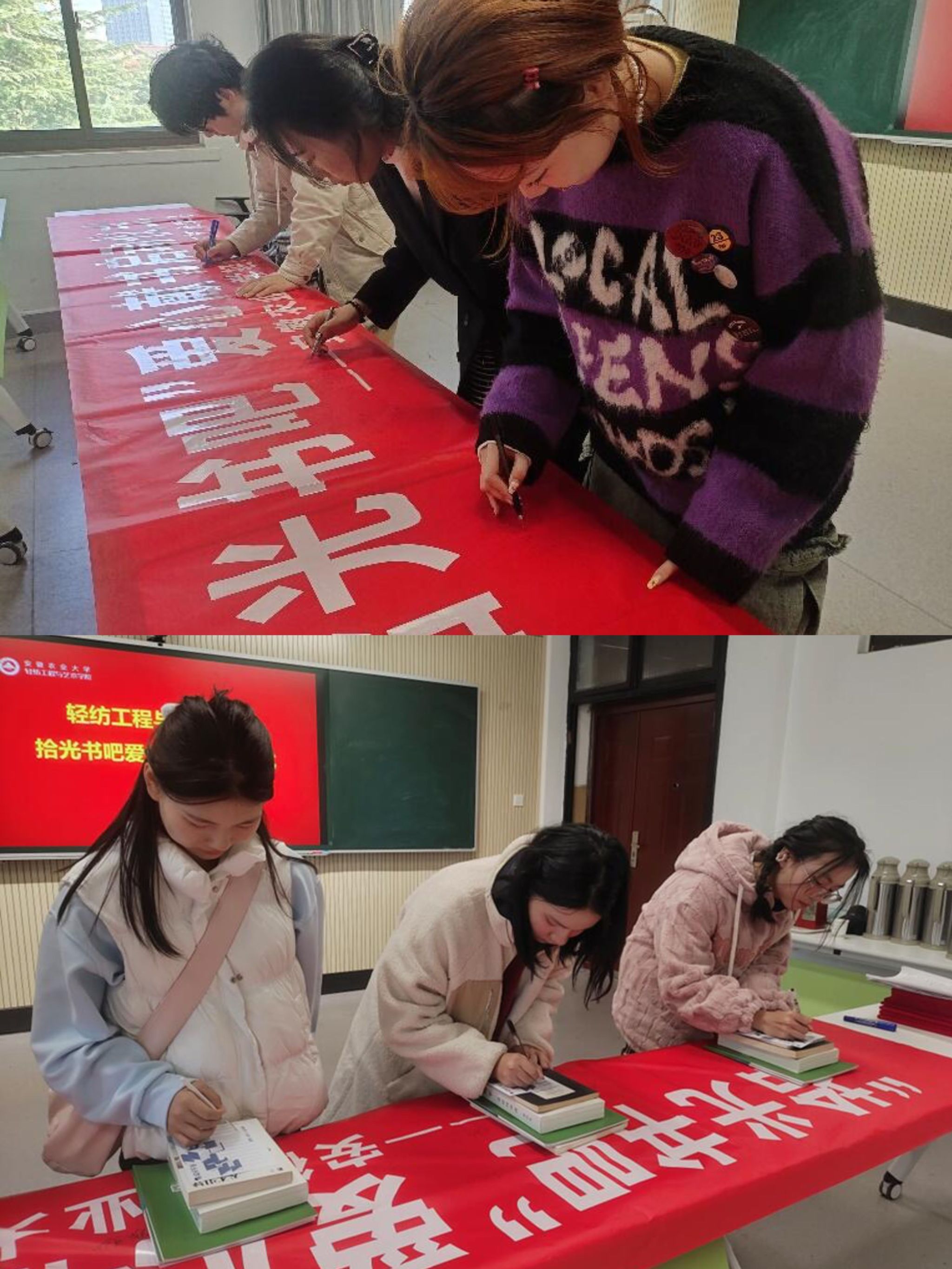 捐书启动仪式活动现场,同学们在横幅上签名留念,共同见证这个有意义的时刻。在捐书活动结束后以院系为单位,将全校捐赠的图书收集整理。(吕凡 一审:张飞)