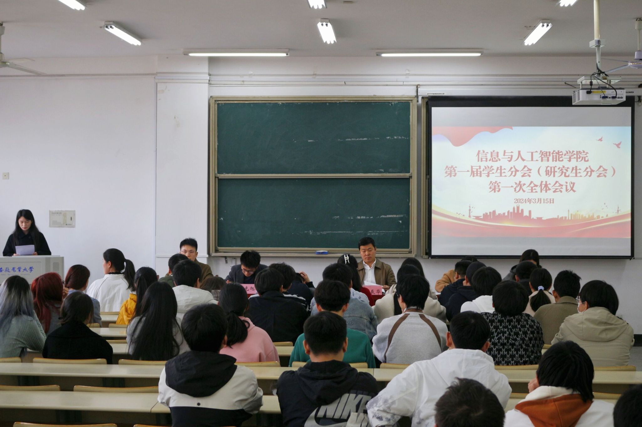 本网讯 3月15日,信息与人工智能学院第一届学生分会(研究生分会)第一次全体会议在信智楼202教室召开。学院党委书记吴辰华,党委副书记、纪委书记李南飞出席会议,学院办公室相关负责老师、第一届学生分会(研究生分会)全体成员和各年级各专业班长参加会议。