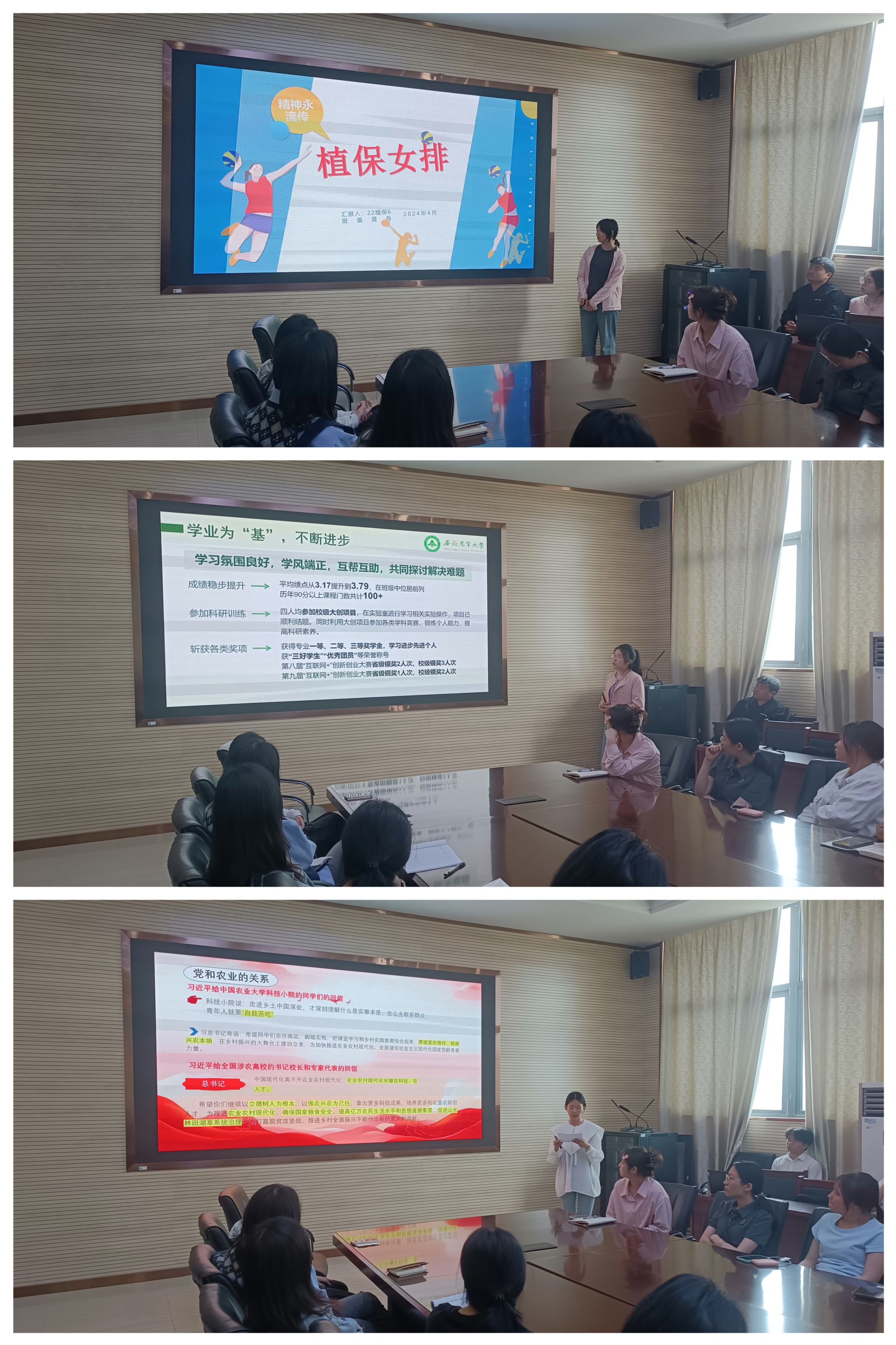 “榜样的力量是无穷的”“优秀不止一种模样……”会上,习言习语分享篇章中,榜样人物代表分别汇报了世界读书日、“三牛”精神内涵、青年人自找苦吃和党纪学习教育的相关内容。青春榜样引领环节中,代表分享了“植保女排”精神、星级示范宿舍事迹以及“我与安农”成长的6年。现场气氛温馨热烈,收获了掌声与感动,师生荣誉感、获得感溢于言表。会上,同学们还就近期的学习、生活等方面的问题作了沟通和交流。(文图/张小龙 编辑/丁放 预审/汪小强 审核/魏安康)
