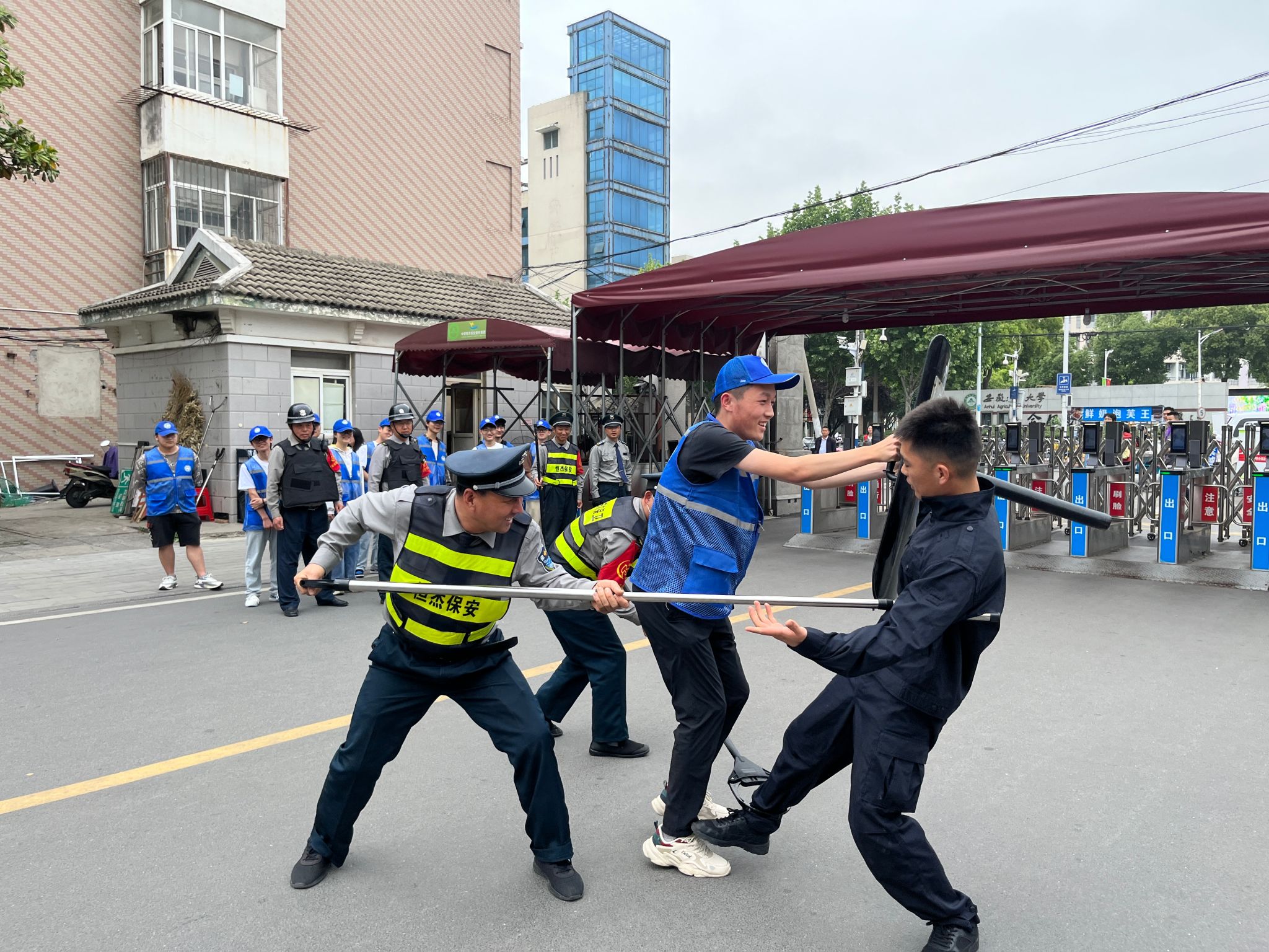 会议结束后,辖区民警带领志愿者们参与了反恐演练。