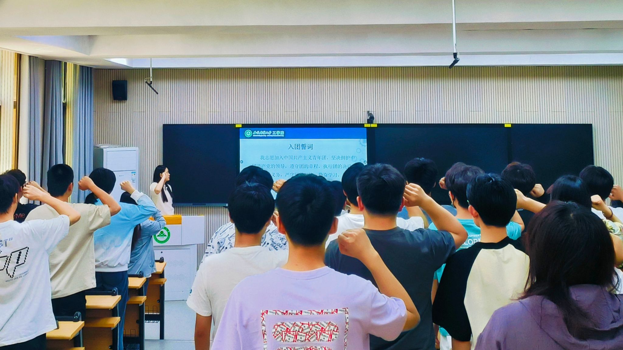 在庄严嘹亮的国歌声中,入团仪式正式拉开序幕,全体团员青年高唱国歌。主持人宣布了新团员名单,各班级团支书为本支部新发展团员佩戴团徽。入团宣誓现场,在领誓人的带领下,全体团员面向团旗庄严宣誓。铿锵有力的誓言在教室久久回荡,共青团再添新鲜血液。