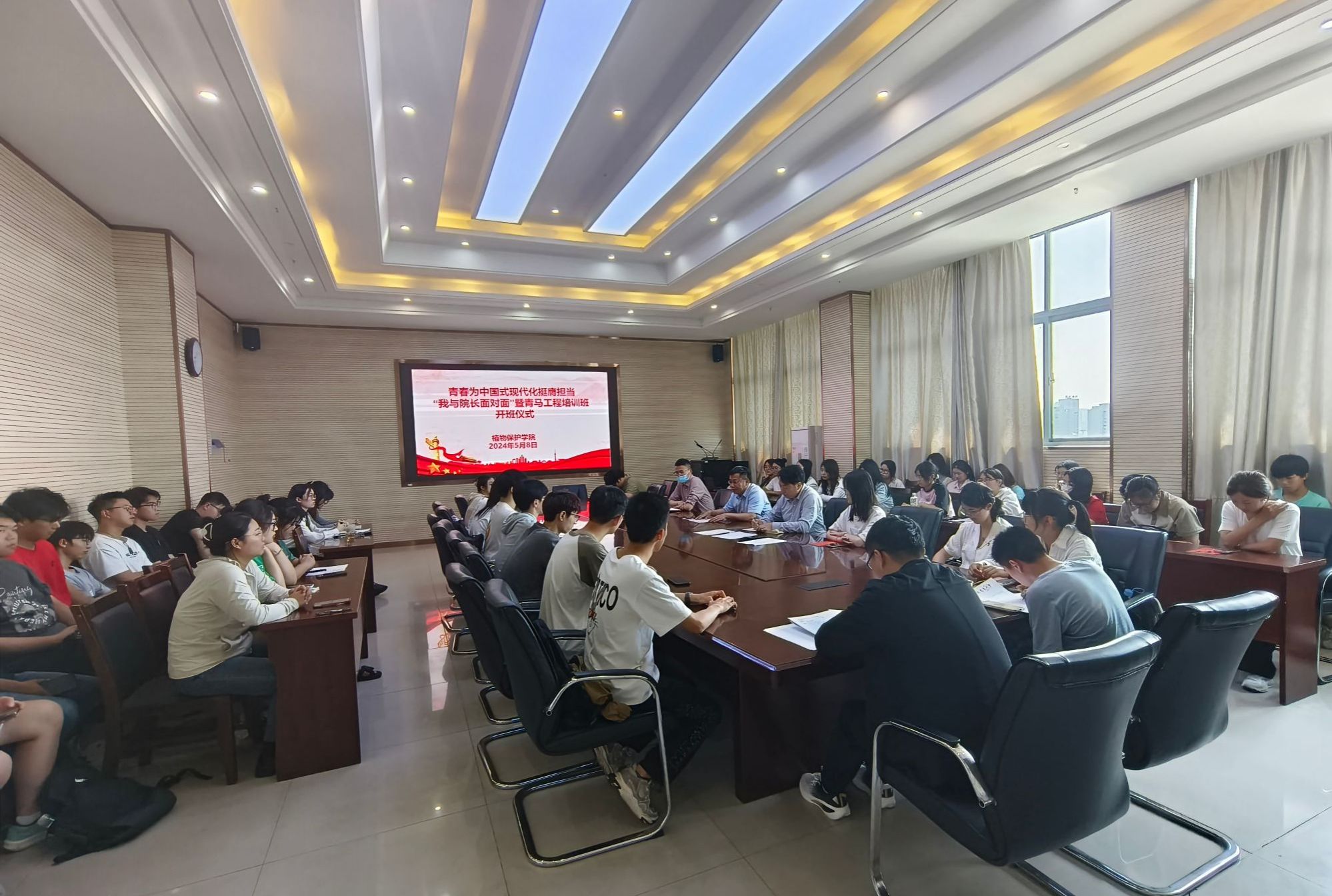 本网讯 5月8日中午,植物保护学院在中西部综合楼1213会议室举办“我与院长面对面”暨青马工程班开班仪式,院长潘月敏、副院长方庆奎出席会议。学院团学负责老师、团干部、2023级本科生和研究生班级团支部书记、宣传委员、思政委员和2024年上半年新发展团员参加会议。会议由学院党委副书记汪小强主持。