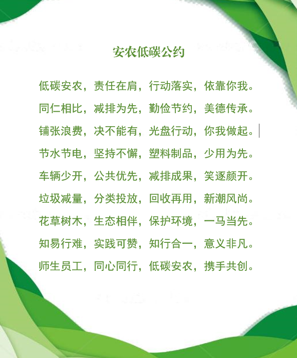 “安农低碳公约”采用朗朗上口的四字词语,倡导全体师生同心同行,携手共创低碳安农。(文图/张焕 编辑/胡先业 预审/夏利明 审核/魏安康)