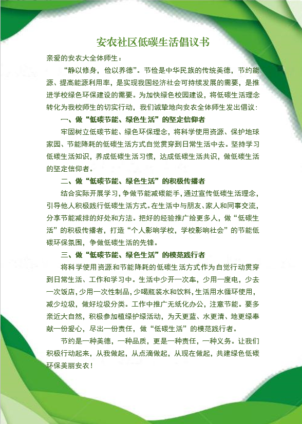 “低碳生活倡议书”指出,节俭是中华民族的传统美德,节能减排是我们的历史使命和义不容辞的责任。节约能源、提高能源利用效率,是推进学校绿色环保建设的需要。为了加快绿色校园建设,林学与园林学院学子特别向全校师生发出倡议,呼吁全体师生做“低碳节能、绿色生活”的坚定信仰者、积极传播者和模范践行者,共建绿色低碳环保美丽安农。