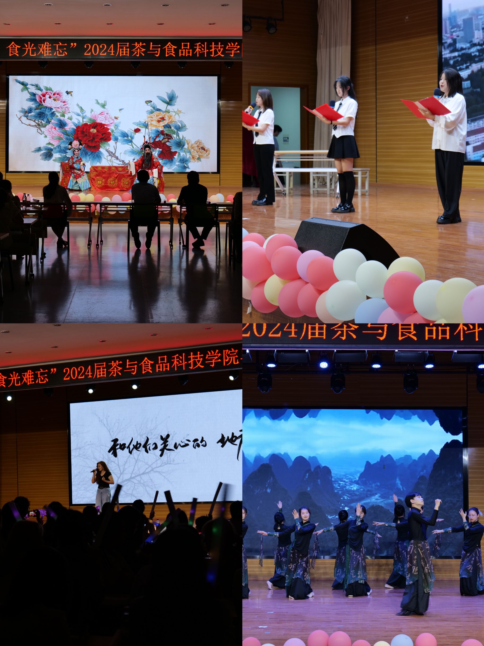 本次晚会以“茶韵流芳,“食”(时)光难忘”为主题,围绕“夏风予信”、“花簇满径”和“逐梦星河”三个篇章展开。伴随着大屏幕上播放的2024届毕业生在校期间的一幕幕情景,晚会在充满活力的舞蹈《I will see you there tomorrow》中拉开了序幕。歌曲《忽而今夏》、《云烟成雨》、《如果可以》让毕业生更加珍惜时光、留念母校。朗诵节目《少年游》、合唱歌曲《夜空中最亮的星》让毕业生对未来美好生活充满向往。舞蹈《青山远黛》激发了毕业生建设祖国大好河山的豪情壮志;舞蹈《Poppin’love》、《不为谁而作的歌》热力四射,凸显青年学生的青春活力;京剧《四郎探母》让同学们深切感受到了国粹的魅力。