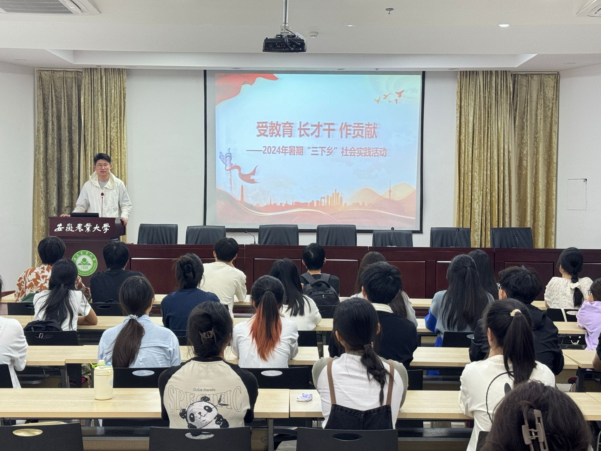 本网讯 为了确保今年大学生暑期“三下乡”社会实践活动顺利开展,帮助大学生在开展实践调研和撰写实践报告方面更加规范、多出成果,6月6日晚,资源与环境学院在中西部综合楼南楼久易报告厅举行2024年大学生暑期“三下乡”社会实践专题辅导报告会,特邀校团委挂职副书记葛伦伟作专题辅导。学院专职团干部、往年学院社会实践服务队骨干成员和21、22、23级本科生代表等120余人参加报告会。