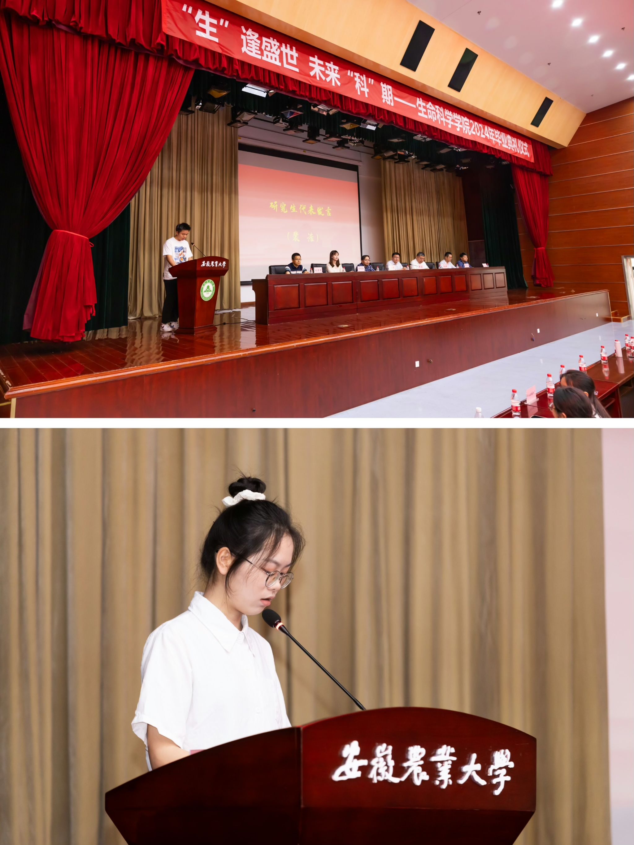毕业生代表20级生创班本科生李文琦、21级生物学博士裴浩依次发言。李文琦回顾了四年中的成长与蜕变,对学院托举青年学子成长成才致以感谢,表达了对学校的不舍之情,对老师、同学的感激之情。裴浩在发言中回望了自己在学院5年学习科研之路中经历的难忘时刻,他表示,毕业生们应当 “胸怀社稷,心存敬畏,心存感恩,心存明白”,未来的逐梦之路将用所学所知振兴祖国、回报社会,慎思笃行,奋发有为。