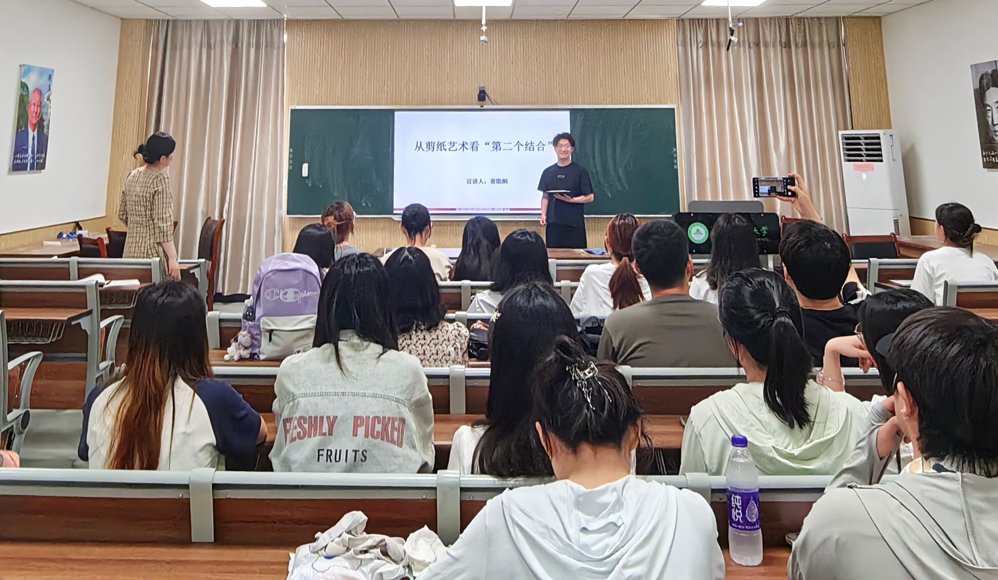 本网讯 6月12日,人文社会科学学院汉语言文学学生党支部在人文楼202教室开展廉洁文化专题学习活动,校青年宣讲团成员黄勖桐将廉洁文化与中华传统剪纸艺术相结合为学生党员们宣讲。
