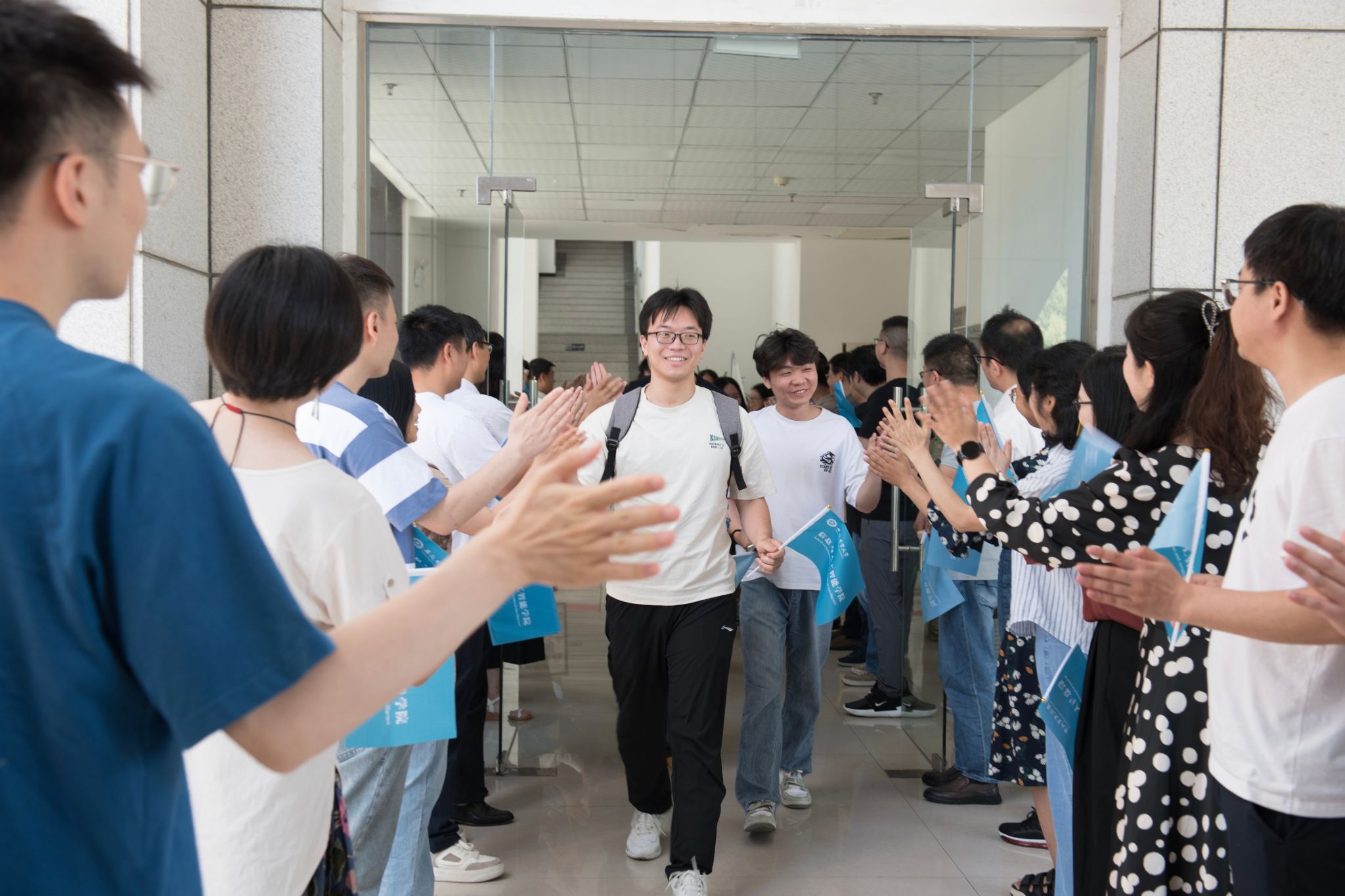 典礼暨欢送会结束时,与会全体领导、教师、辅导员移步第一报告厅出口,站至两侧,与每一位毕业生击掌告别。(图/范雅辰 文/肖红雨 编辑/邓菁菁 初审/李南飞 审核/魏安康)