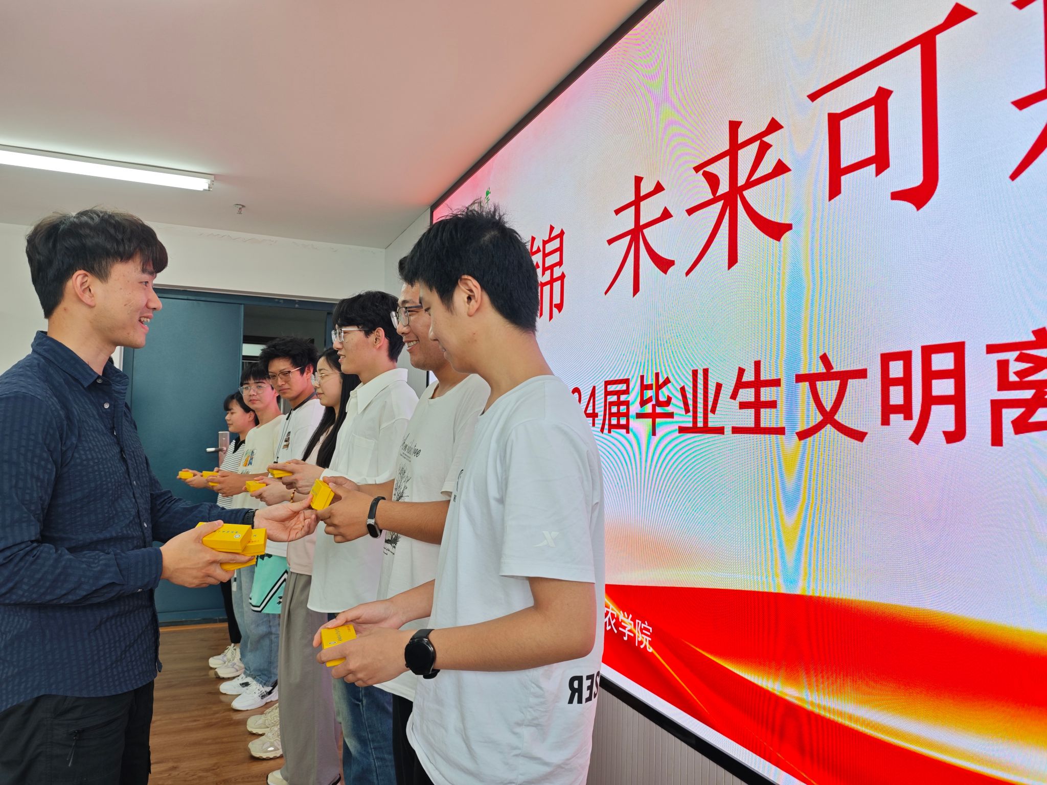 一场班会,文明离校,向阳而生。农学院召开2024届毕业生“爱校荣校,文明离校”主题班会,详细阐述离校注意事项及相关事宜,提醒全体毕业生遵守校纪校规,离校前自觉归还车牌和钥匙、注意自身健康与安全等,以“芯”温暖、用“芯”话别。