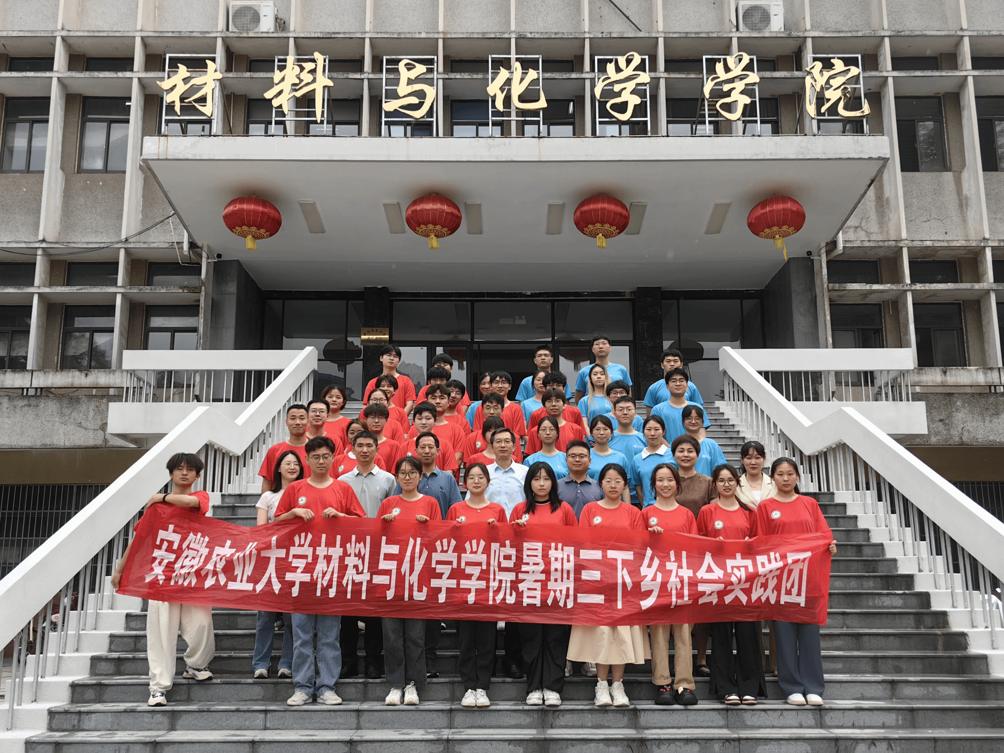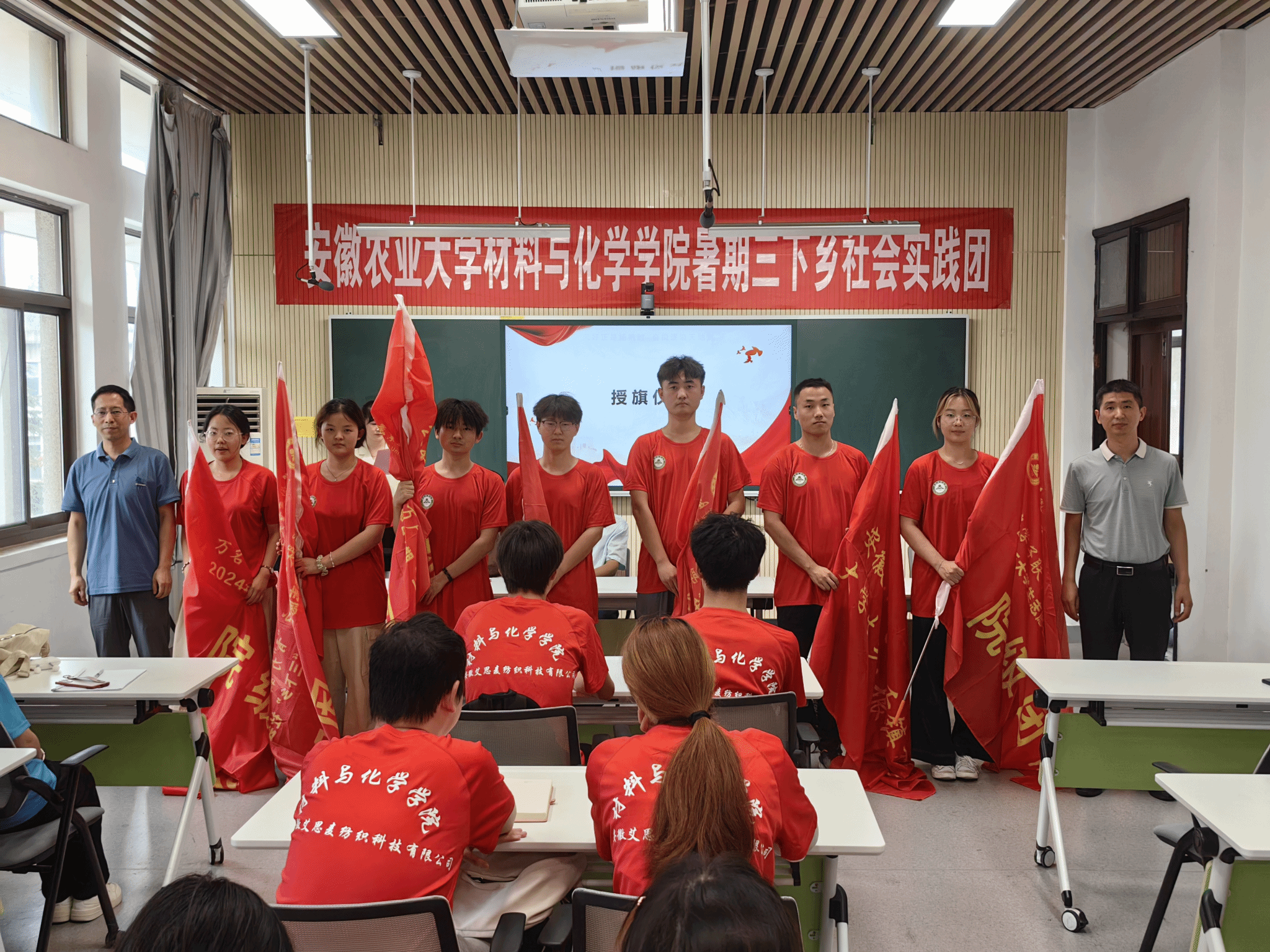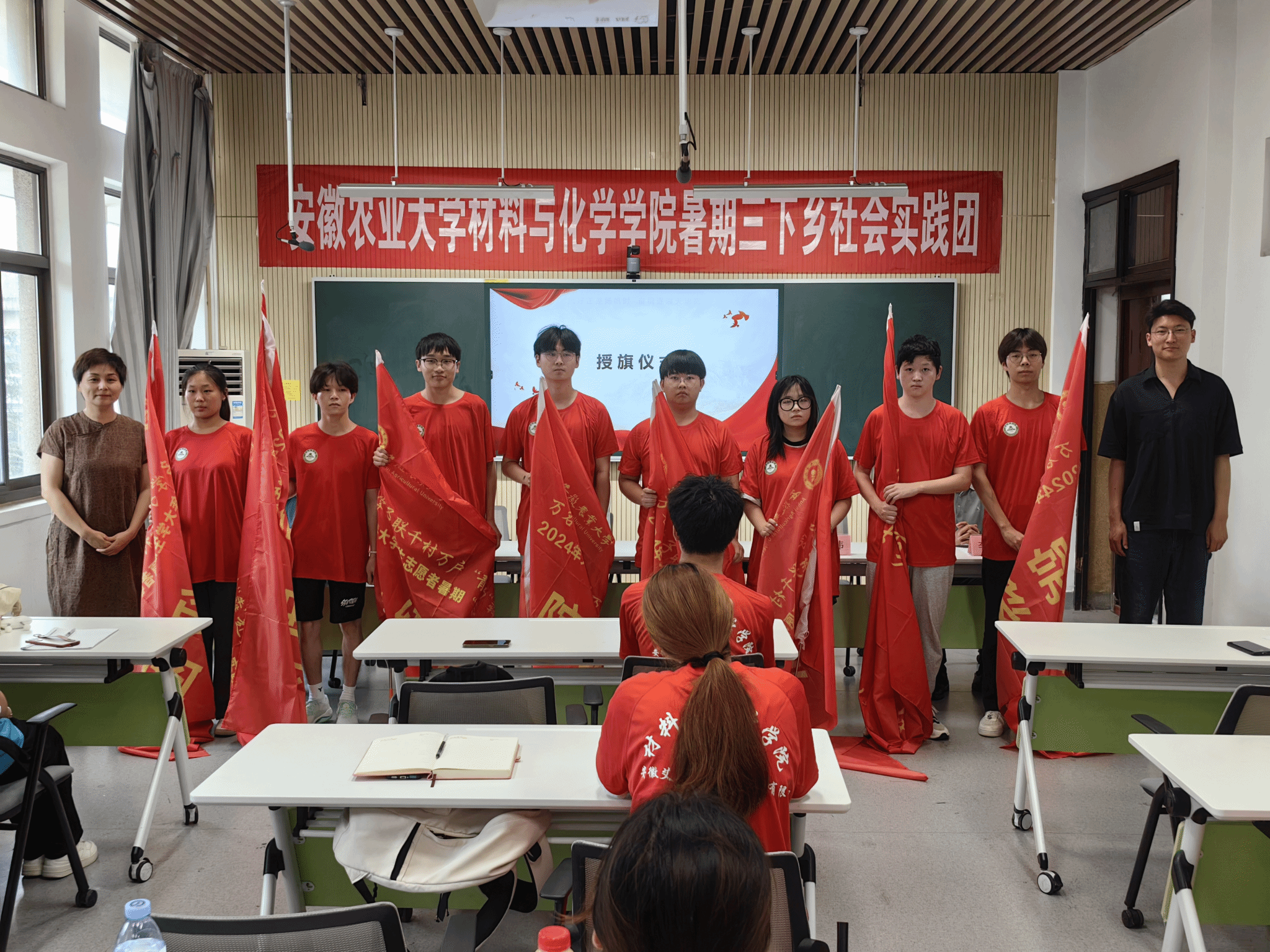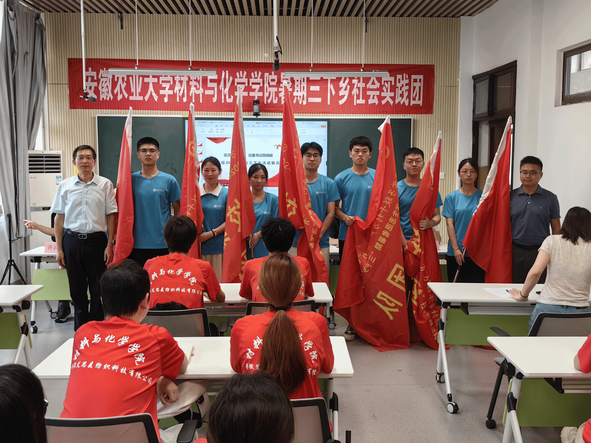 与会领导老师为学院全体暑期“三下乡”社会实践团队授旗并合影留念。
