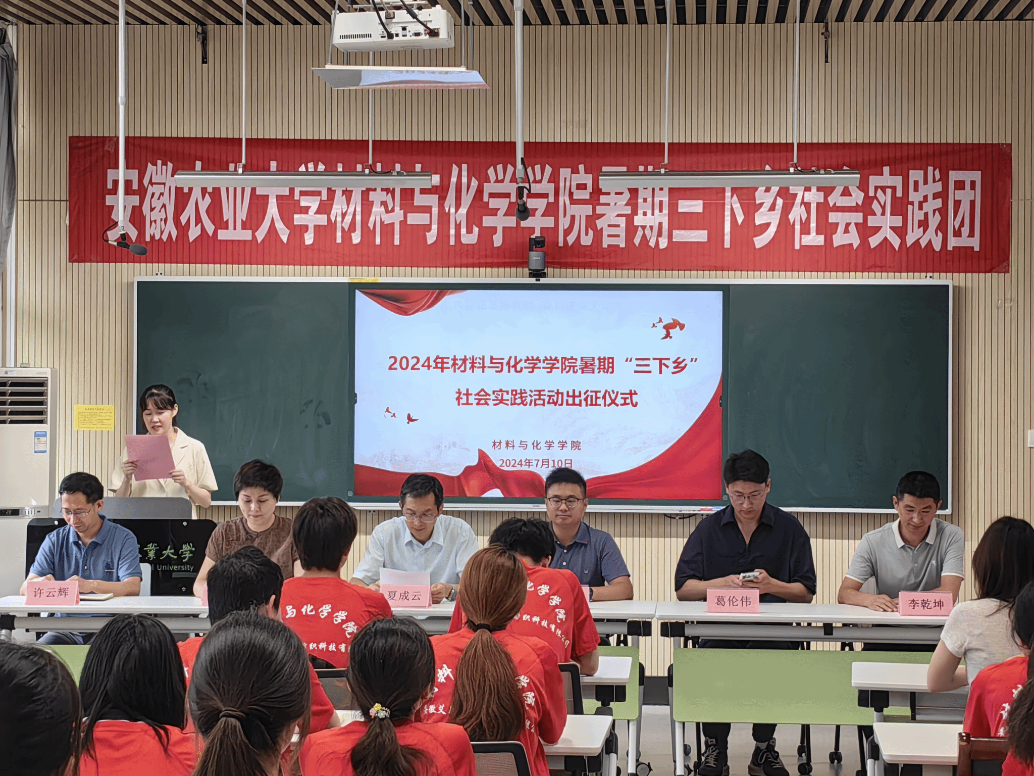 本网讯 7月10号下午,材料与化学学院2024年暑期“三下乡”社会实践活动出征仪式在材化楼402会议室举行。学院党委书记夏成云、学院院长汪钟凯、学院党委副书记周晓娟、学校团委挂职副书记葛伦伟、学院副院长许云辉、学院副院长李乾坤、学院团委书记徐菲及“三下乡”活动学生代表参加了此次活动。