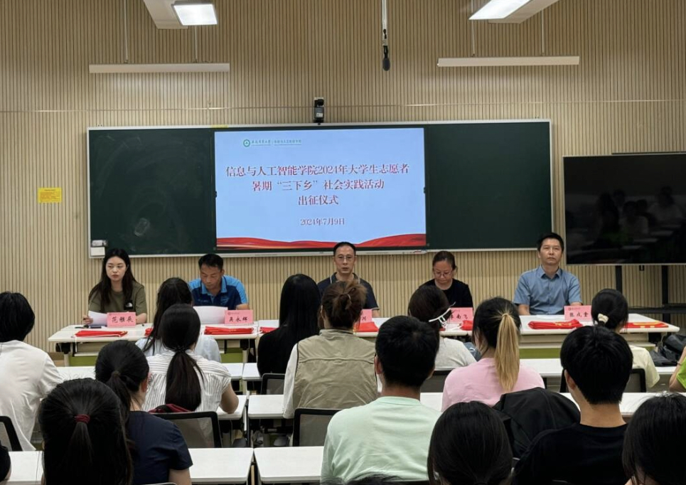 本网讯 7月9日,信息与人工智能学院在经技楼305教室举办2024年暑期“三下乡”社会实践活动出征仪式。学院院长辜丽川、党委副书记李南飞、学院副院长吴永辉、学院副院长张成堂、学院团学工作负责老师以及暑期“三下乡”社会实践活动团队成员代表出席了会议。会上宣读了校级重点团队、校级团队、院级团队立项名单和暑期“三下乡”社会实践活动学院资助办法;学院领导分别为立项团队代表授旗;志愿者代表王斯盈同学作主题宣讲。