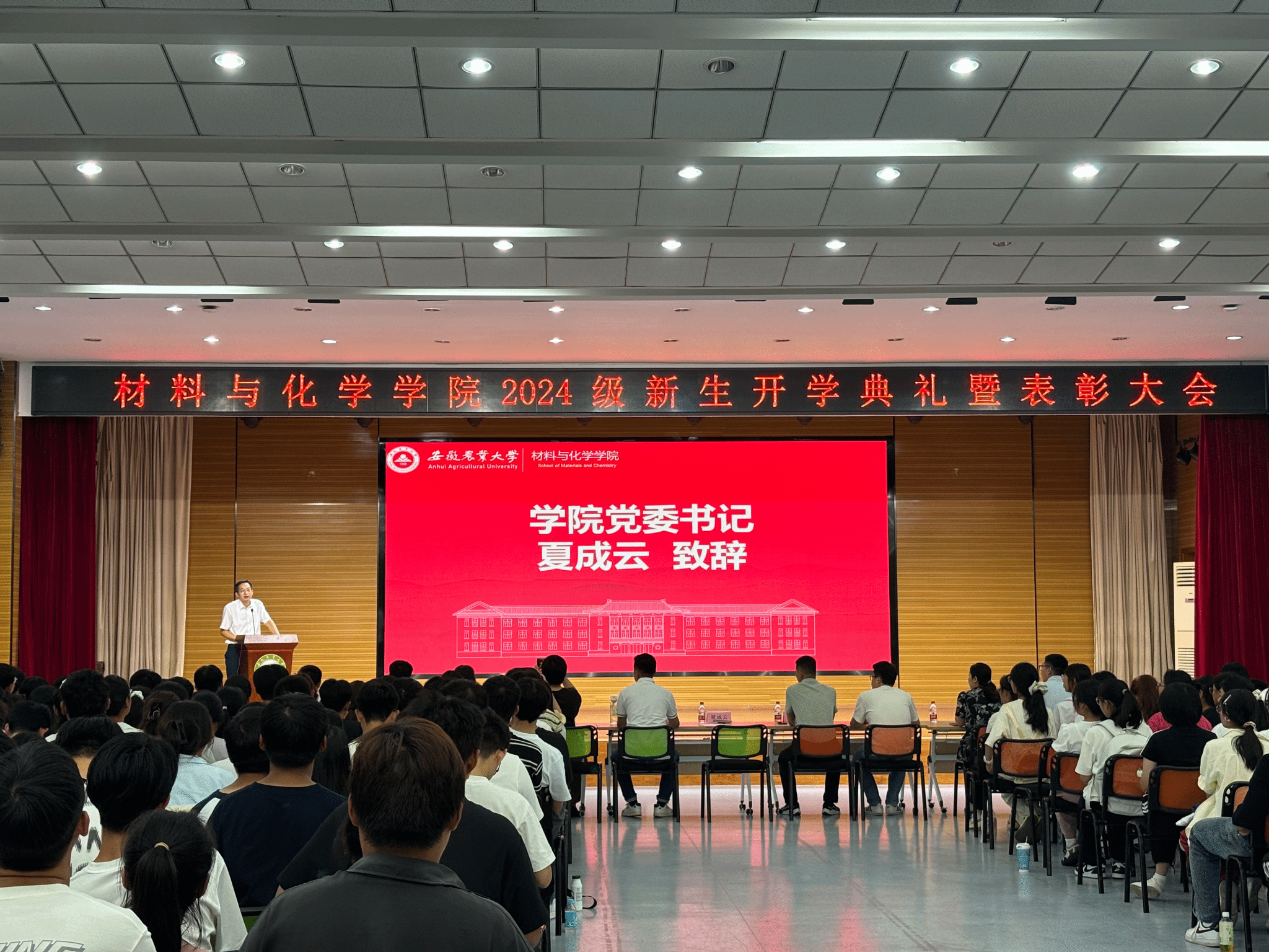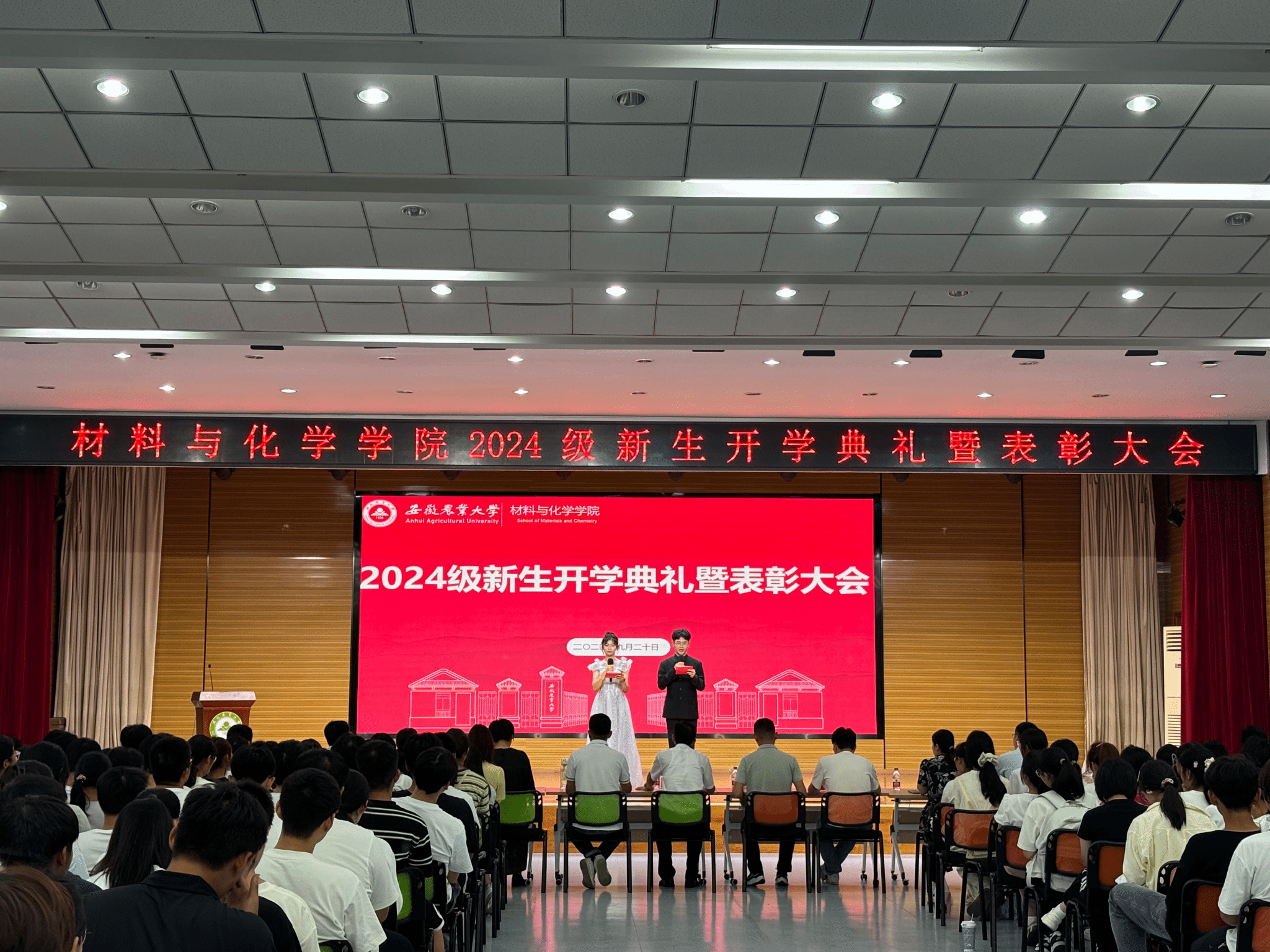 本网讯 9月20晚上,材料与化学学院2024级新生开学典礼暨表彰大会在欣苑四楼小礼堂隆重举行。588名本科生和研究生齐聚于此,学院党委书记夏成云,党委副书记、纪委书记周晓娟,副院长李乾坤,校友代表葛亮亮,以及各系主任、教师代表、全体新生辅导员、班主任出席典礼。