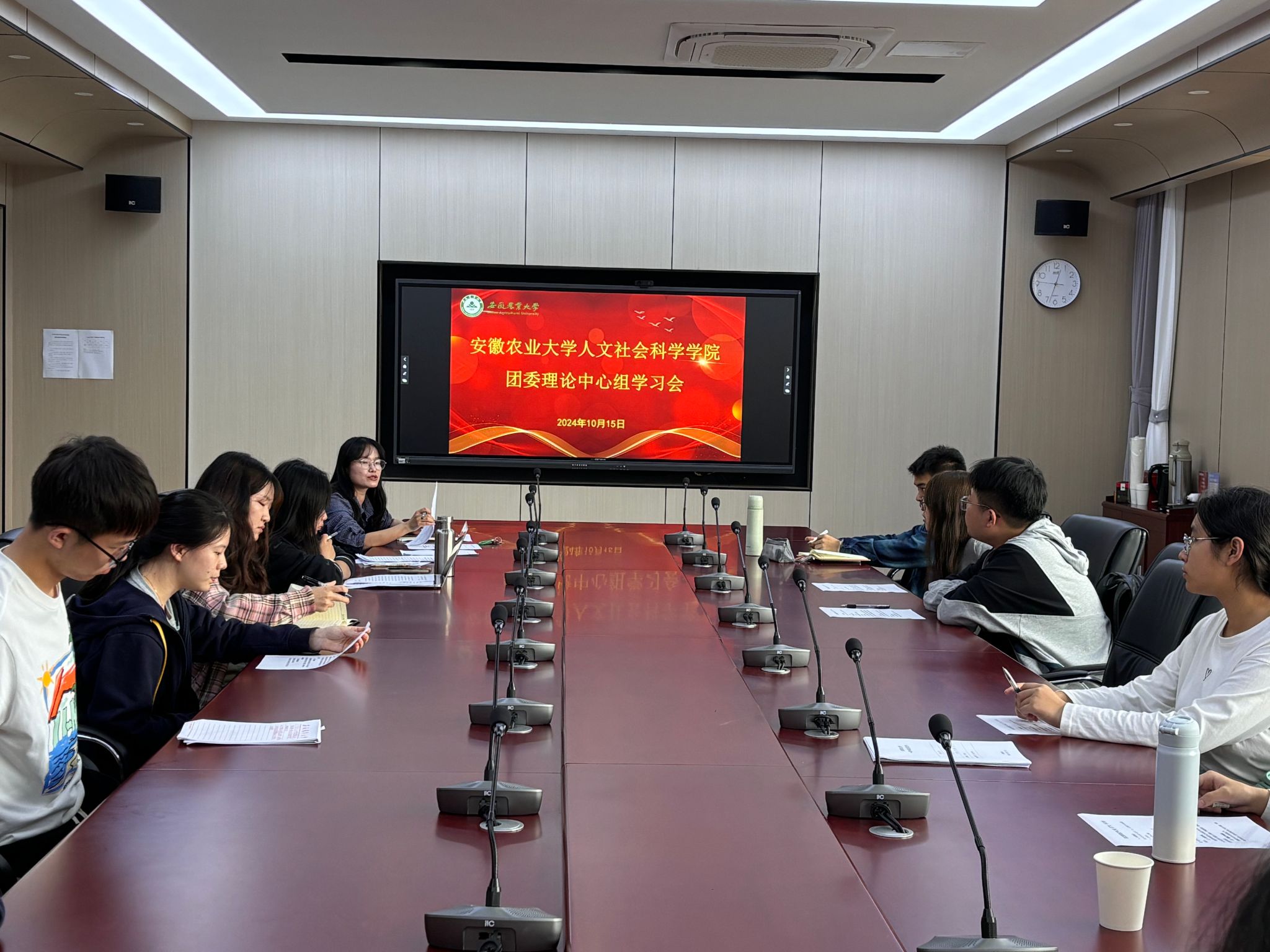 本网讯 10月15日中午,人文社会科学学院在人文楼206会议室召开团委理论学习中心组会议,学院团委兼职副书记、团支部成员参加会议。会议由学院团委老师王静主持。
