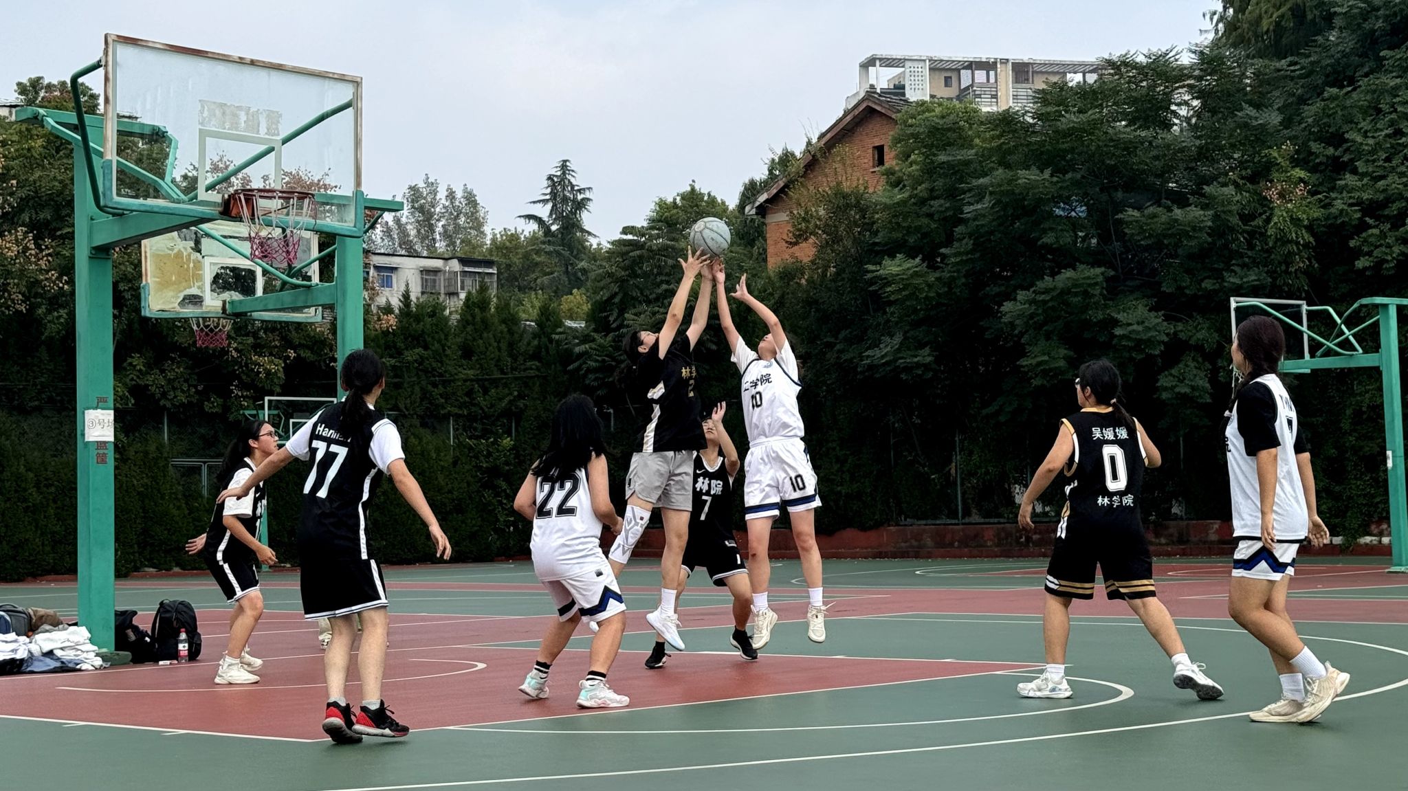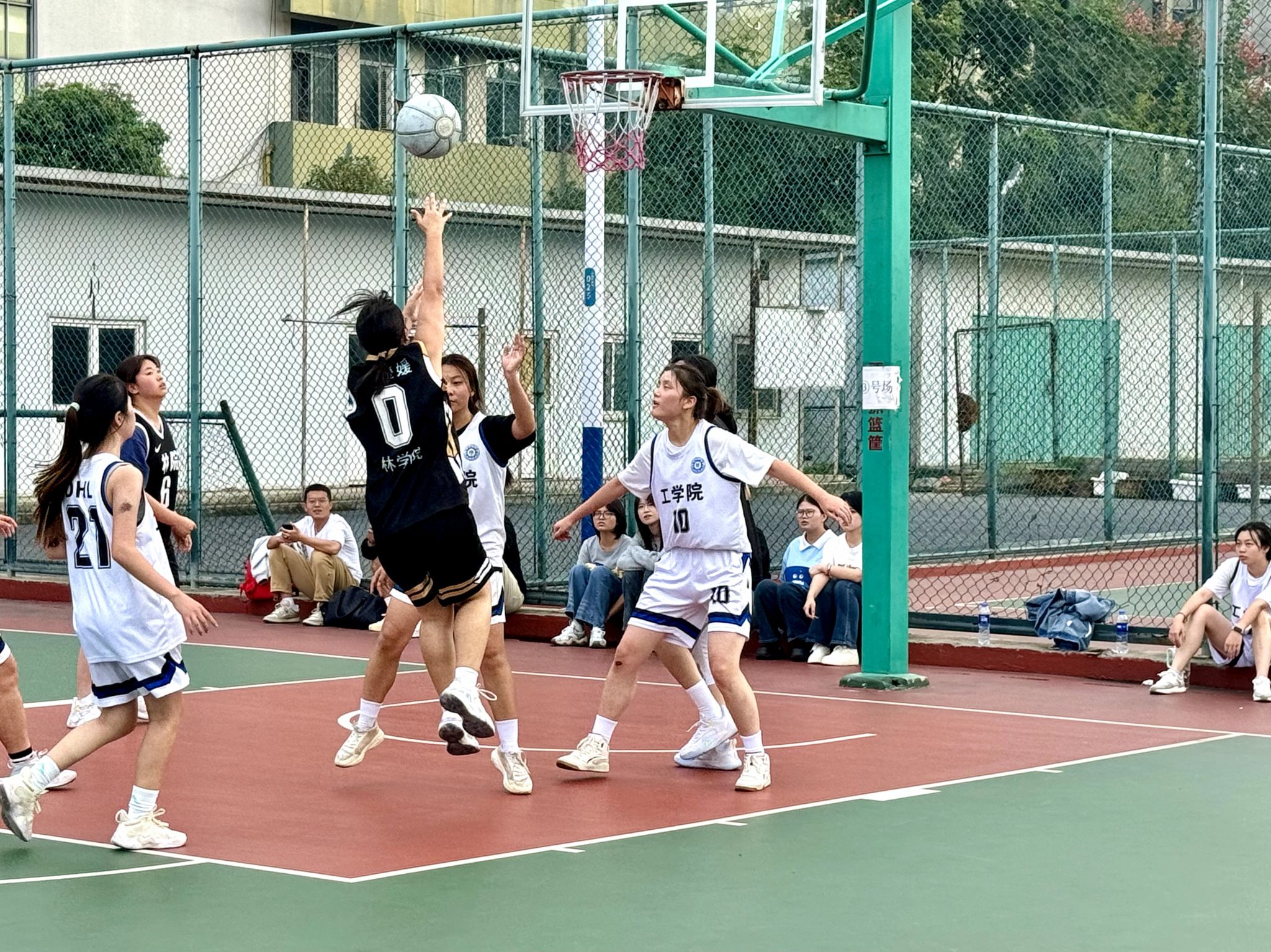 赛场上,双方队员斗志昂扬,激情澎湃。林学院女篮队员们配合默契,进攻果敢,防守严密。她们凭借着顽强的拼搏精神和出色的团队协作,一次次突破工学院的防线,投篮命中。在防守端,她们积极拼抢篮板,不给对手任何可乘之机。