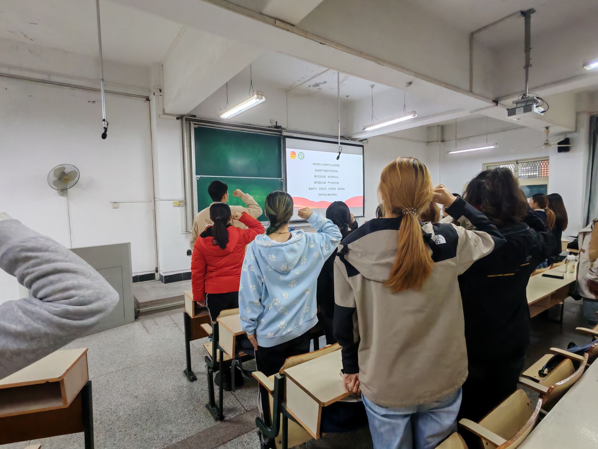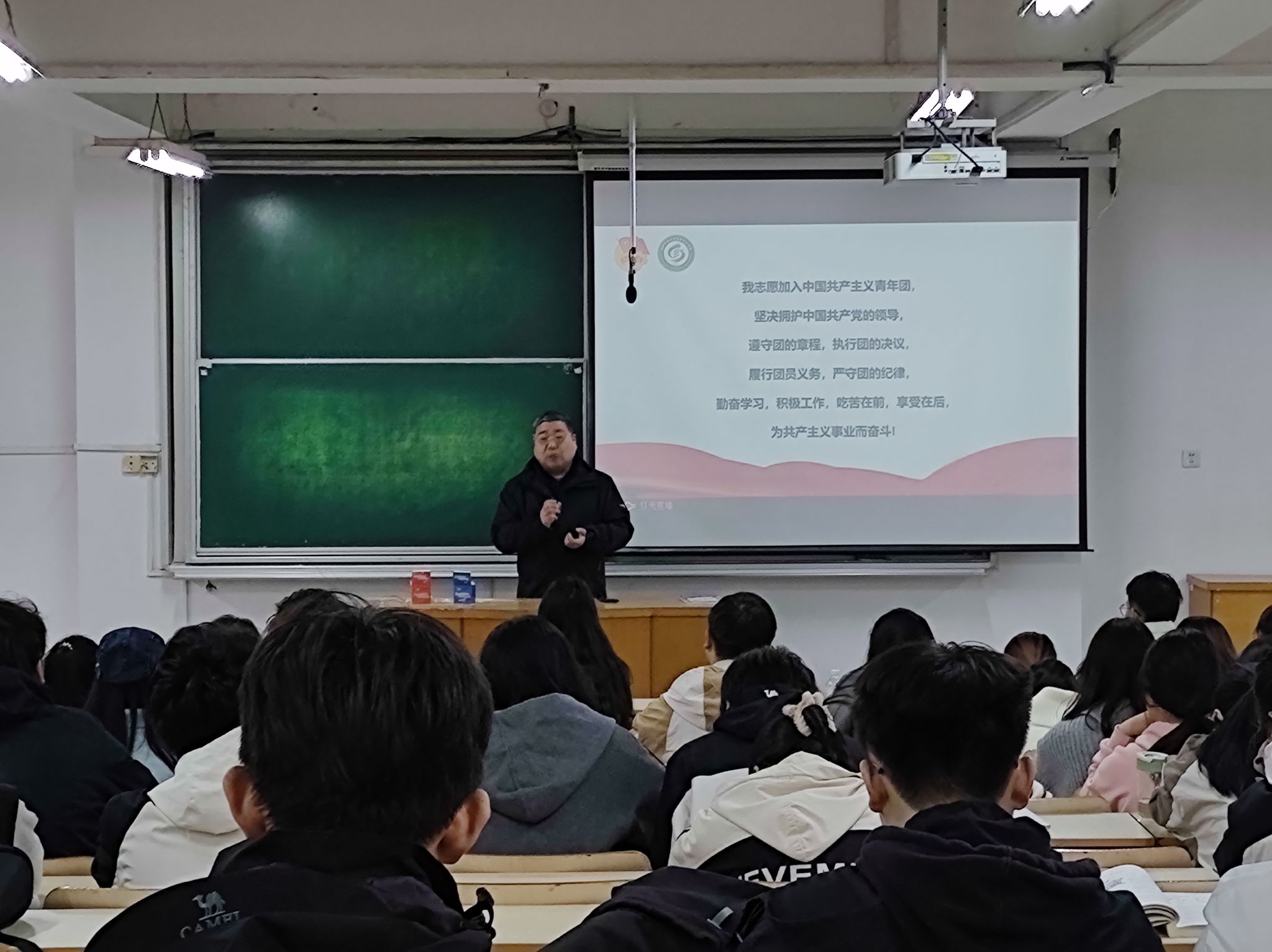 会议在嘹亮的国歌声中拉开序幕。姚剑波宣读了本次发展团员名单,闫大玮为新发展团员佩戴团徽,对新晋团员表示祝贺,祝贺大家经过层层选拔加入共青团大家庭,希望同学们永葆入团初心,牢记团员身份,以实际行动积极向党组织靠拢。同时,闫大玮对全体与会同学们提出期望,希望同学们牢记习近平总书记对青年的嘱托,不断增强做中国人的志气、骨气和底气,在人生最美好的年华,在一个最好的时代,勤奋学习,勇敢追梦,努力提高自身综合素质,在实现第二个百年奋斗目标的伟大征程上贡献自己应有的青春力量。随后姚剑波带领大家一起进行入团宣誓。大会在嘹亮的《光荣啊,中国共青团》歌声中结束。