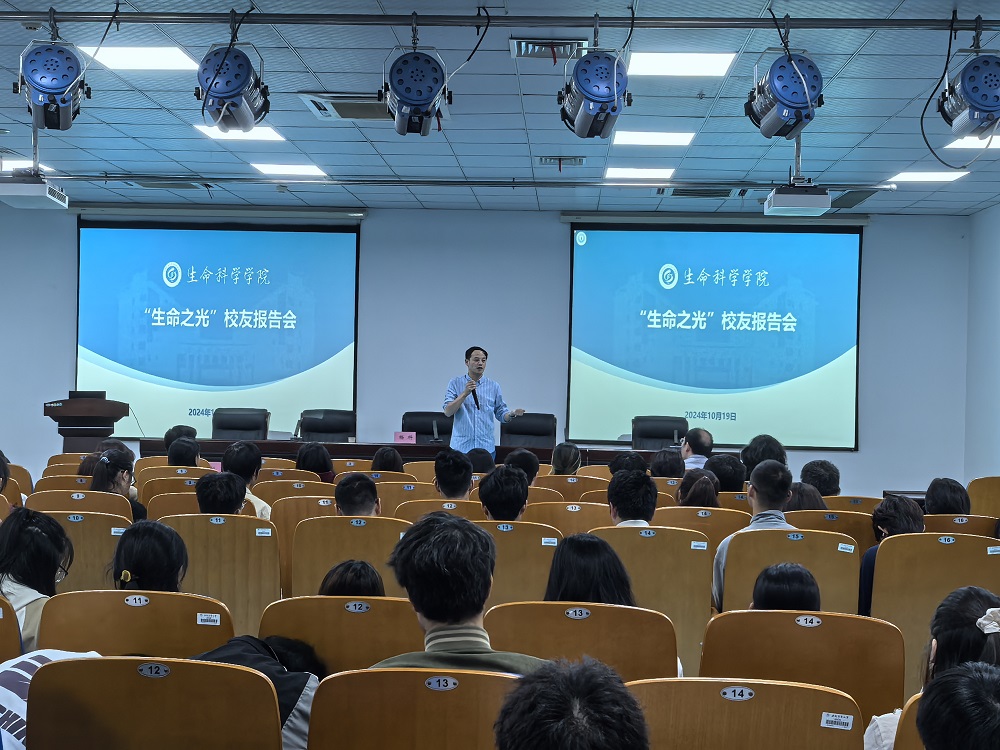 本网讯 10月19日上午,学院在生物科技楼B438报告厅举办“生科之光”优秀校友报告会。两位2004届生物技术专业优秀毕业生,希肯生物技术(苏州)有限公司总经理杨科和安徽国科检测科技有限公司副总经理高柱,为全体2024级学生作报告,报告会由学院党委书记曹雷主持。