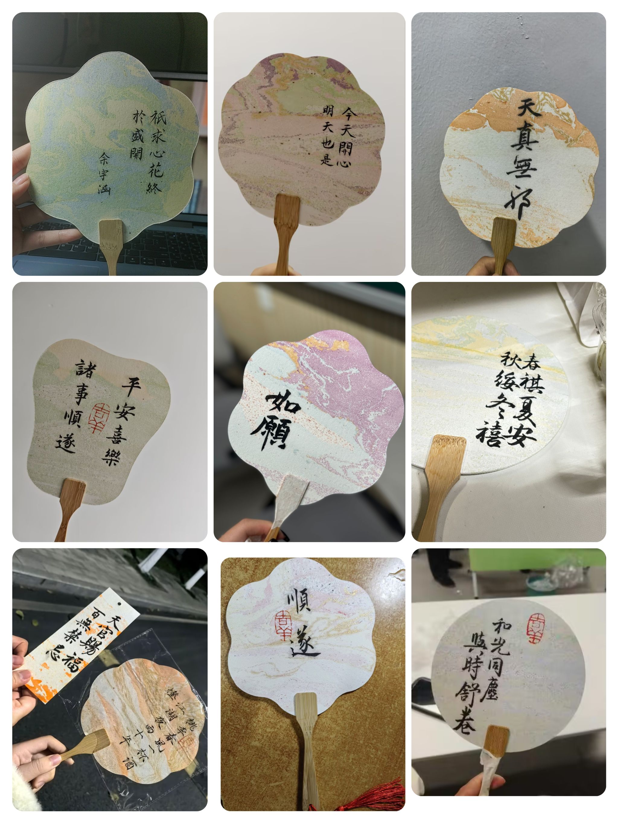 同学们用不同的配色与手法将脑海中的画面展现在扇面上,有的同学在扇面题上寥寥几字丰富主题,有的同学则顺势添上几笔勾勒出古雅的山水风景,一把把原本普通的扇子在同学们的巧手下,逐渐变成了独具匠心的艺术品。