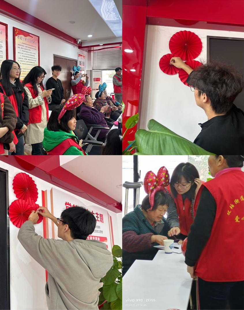 班级团支部深入蜀山区琥珀街道奥林花园社区居委会、北苑村社区,在社区工作人员带领下,打扫卫生、布置庆生场景,与爷爷奶奶们进行友好耐心的沟通交流,大家走访社区老年活动中心,围坐一起拉家常,嘘寒问暖、促膝交谈,向老人们宣讲交通安全及网络电信防诈骗等知识,提升老人们的交通安全意识和防诈骗能力,活动中心不时传来阵阵欢声笑语。同时,志愿者们利用自身所学,发挥熟悉操作电脑的特长帮助社区开展数据系统录入,整理报表和相关系统,进一步丰富和更新社区管理平台信息,提升社区信息综合管理能力。