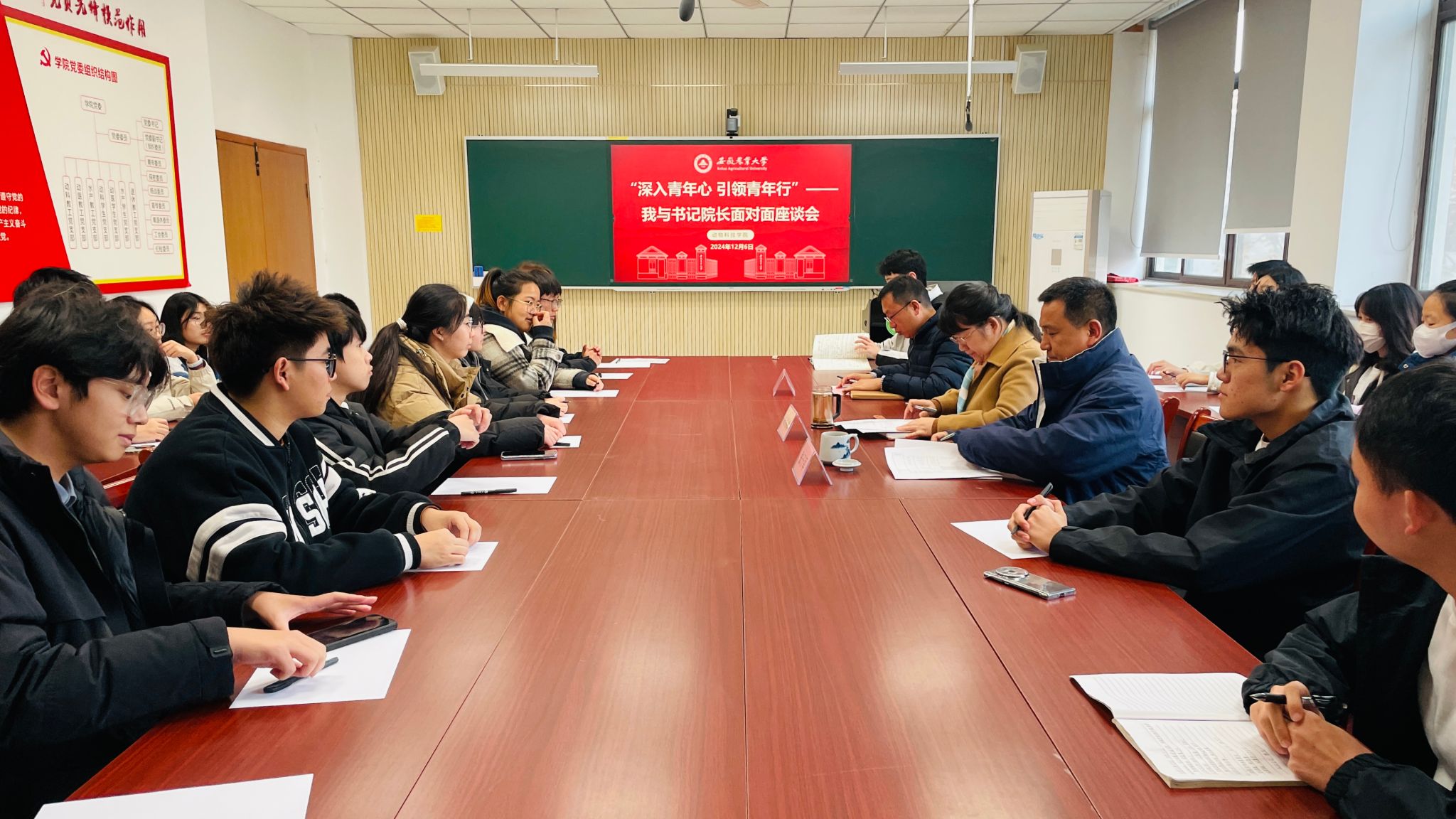 本网讯 12月6日,动物科技学院在动科楼306会议室举办“深入青年心 引领青年行”——我与书记院长面对面座谈会。学院党委书记沈兆梅,院长张子军、团学负责老师、办公室老师及学生代表参加会议。活动由学院副院长曹祖兵主持。