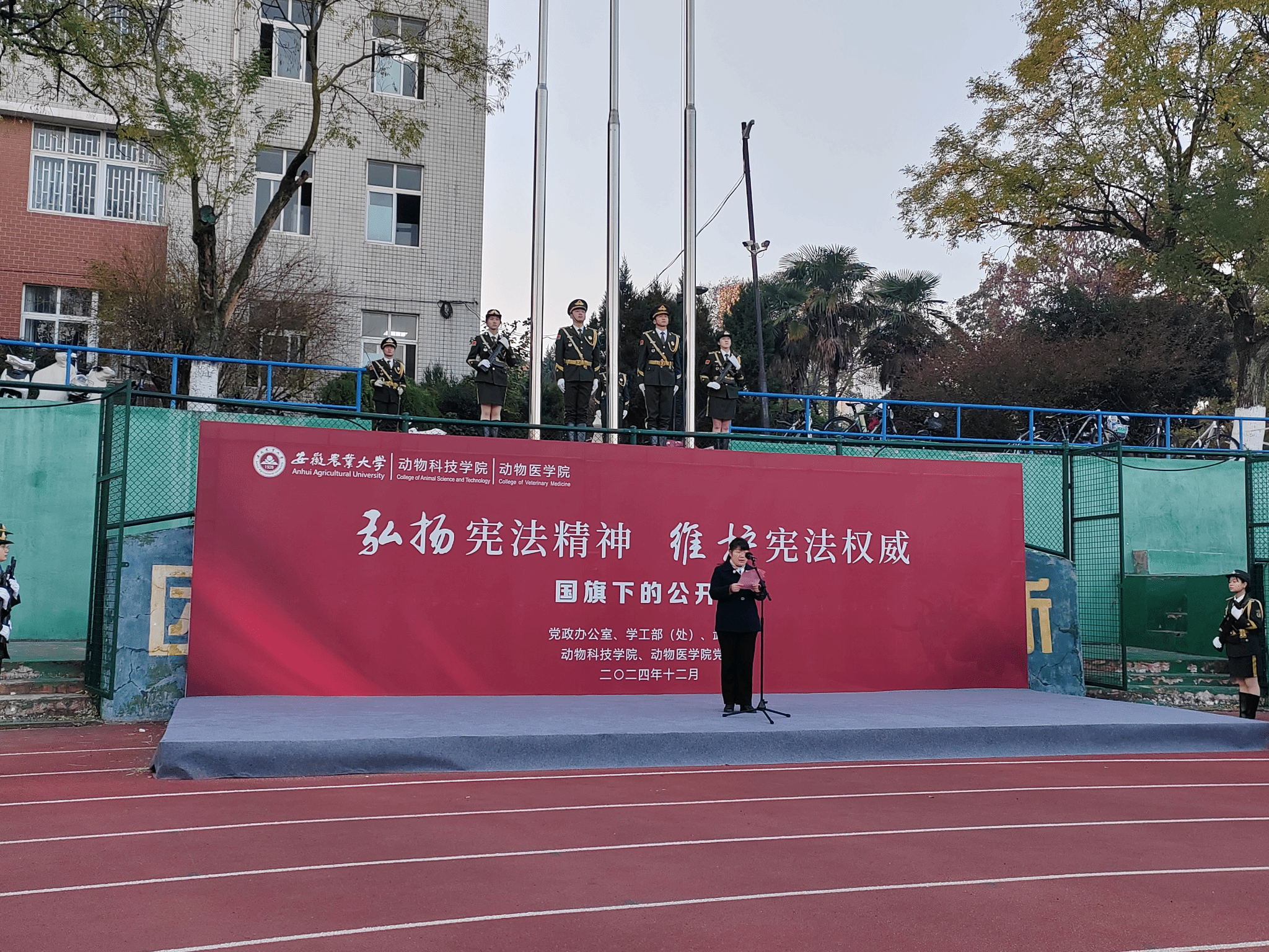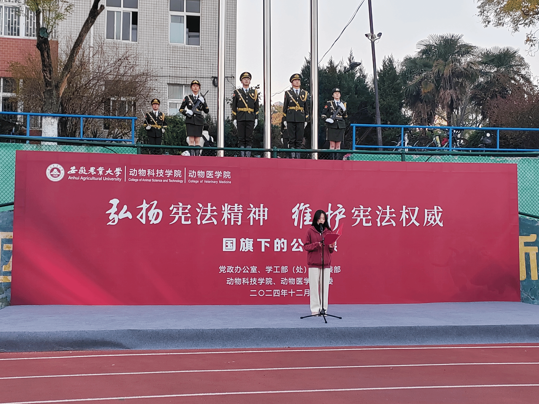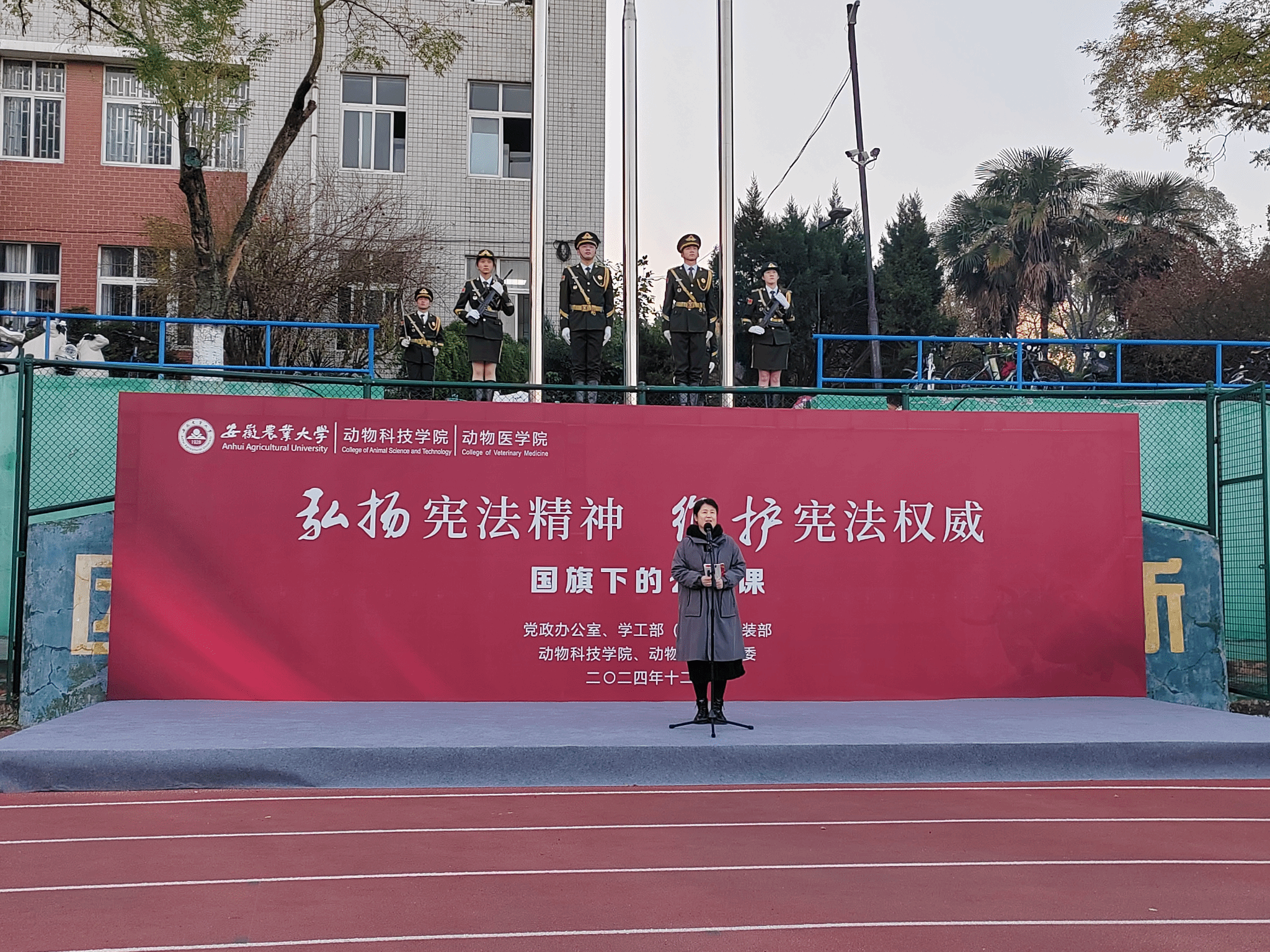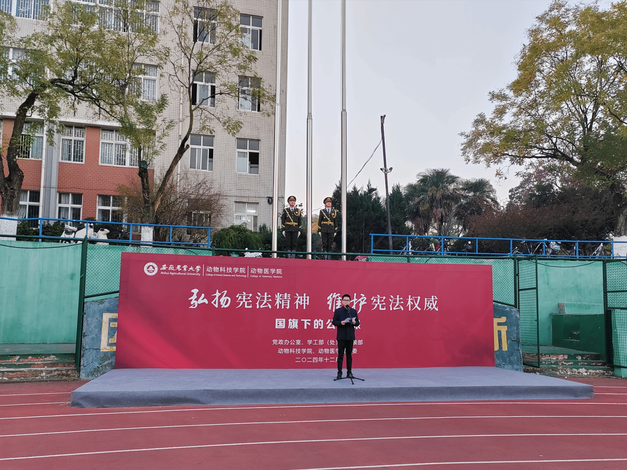 本网讯 12月2日清晨,动物科技学院/动物医学院在校第一运动场举办“弘扬宪法精神 维护宪法权威”主题升旗仪式暨国旗下的公开课。校党政办公室戴照力、校党委学工部(处)副处长、武装部副部长卢伟、学院党政领导班子成员、专职辅导员及2024级全体新生参加升旗仪式。仪式由动物医学院党委副书记章巍主持。
