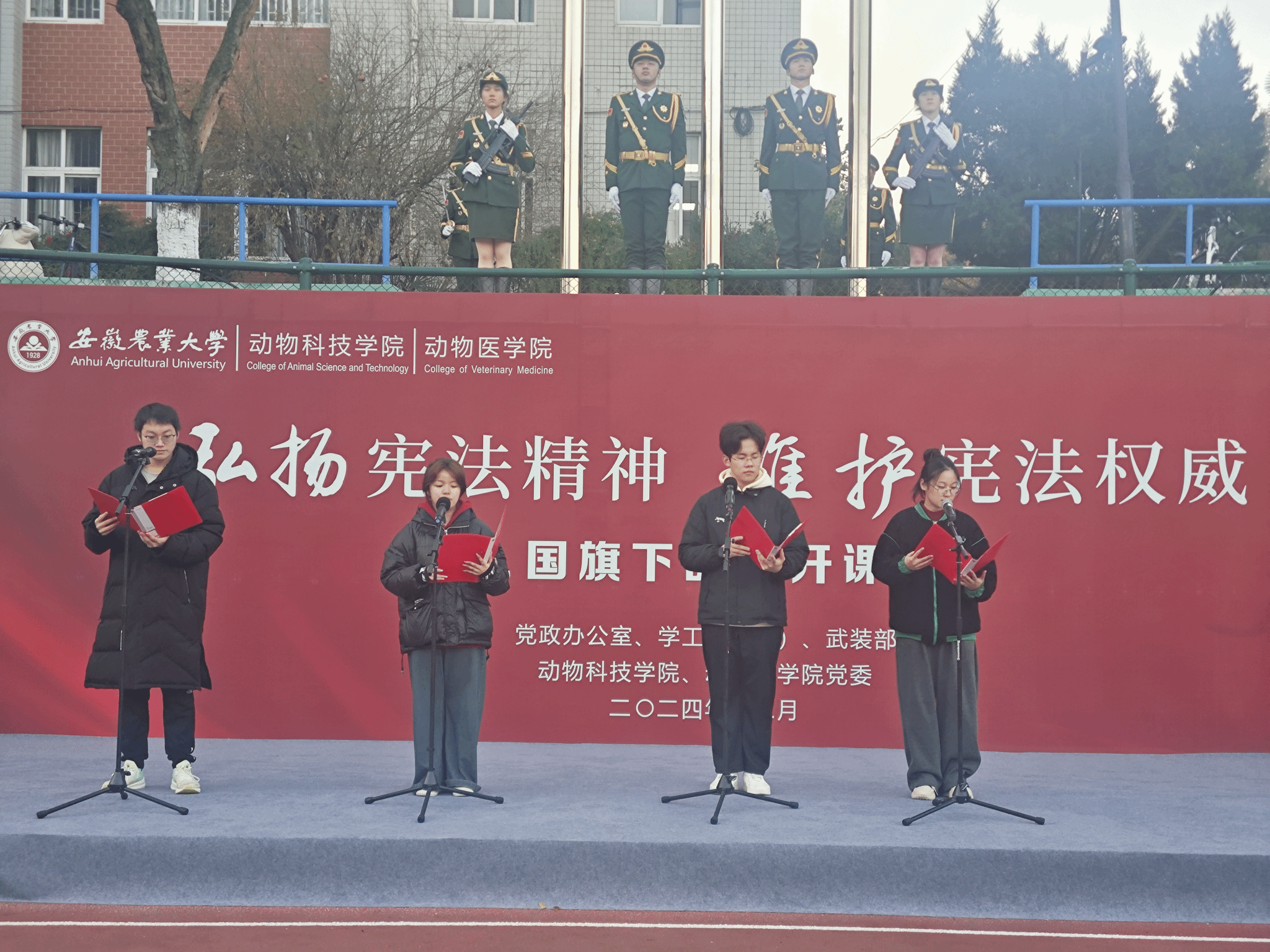 升旗仪式上,学院2022级动物科学专业张姮领读《宪法晨读内容》,在场全体师生共同学习和诵读宪法内容。2024级水产专业张思甜,24级动物科学专业黄思梦、陈瀚文、曹鹏,围绕《宪法在我心中》进行主题朗诵。作为新时代的青年,“我们”每个人都肩负着弘扬宪法精神的重要责任,要努力让“弘扬宪法精神 维护宪法权威”的信念在心中扎根,茁壮成长。