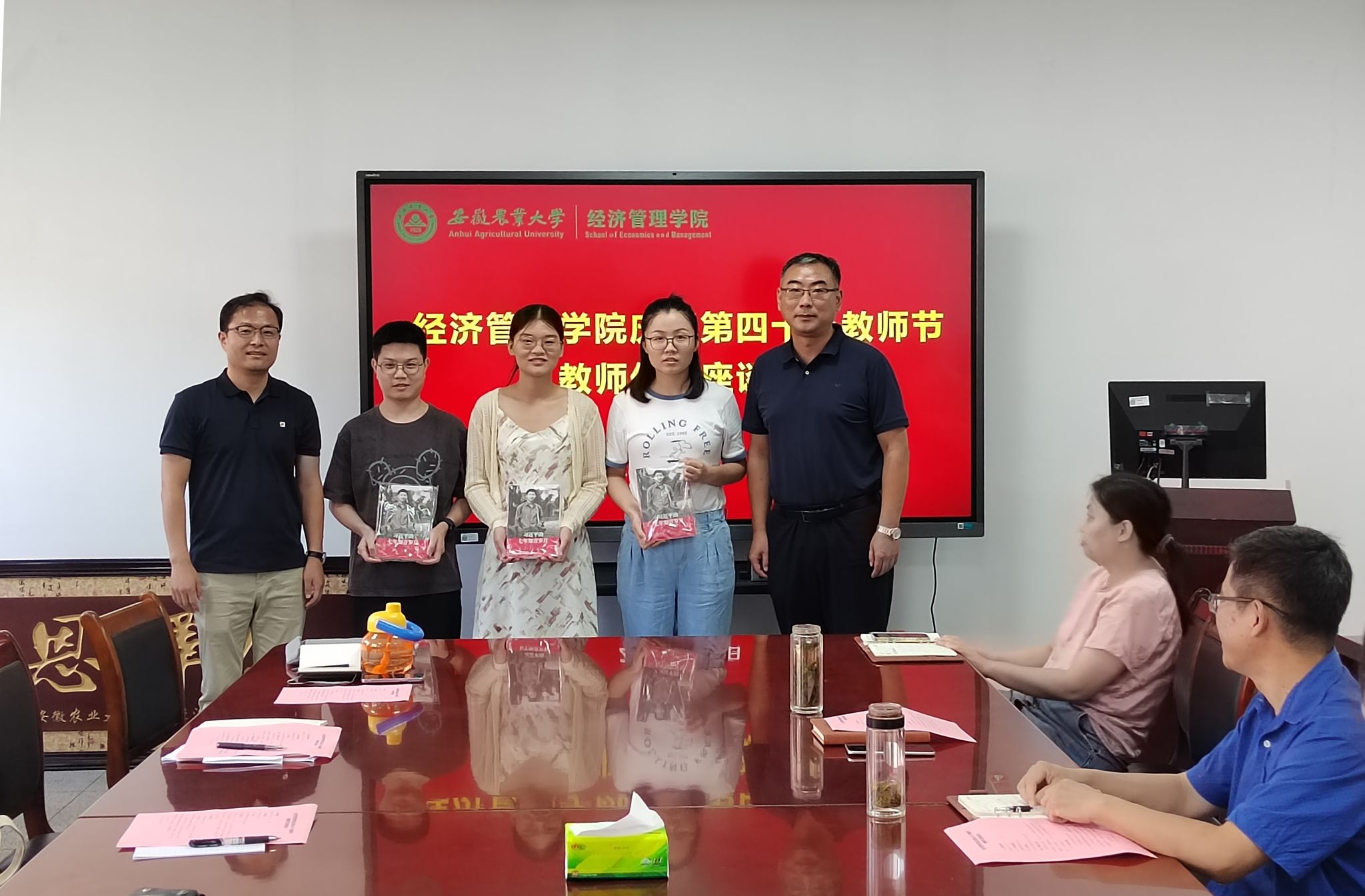 座谈会上,学院精心为新进教职工举办欢迎仪式,向新进教职工赠送书籍。2024年退休教师荣退仪式上,学院向退休教职工赠送了文创纪念品;三位老师所带学生代表向自己的老师敬献鲜花。