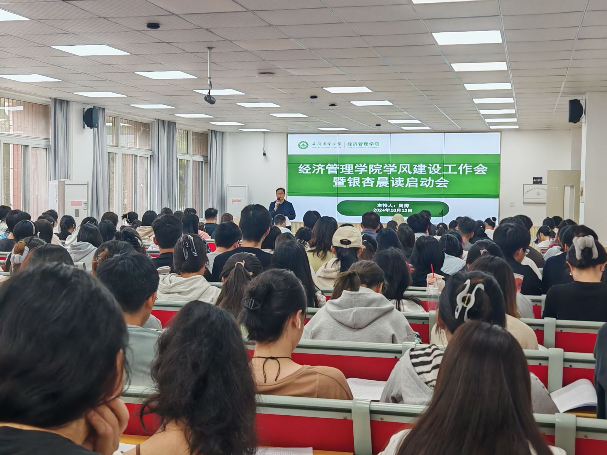 本网讯 10月12日下午,经济管理学院党委副书记、纪委书记周涛在经管楼103会议室主持召开学院学风建设工作会暨银杏晨读启动会。学院专职辅导员,本科四个年级87个班级的班长和学习委员参加会议。