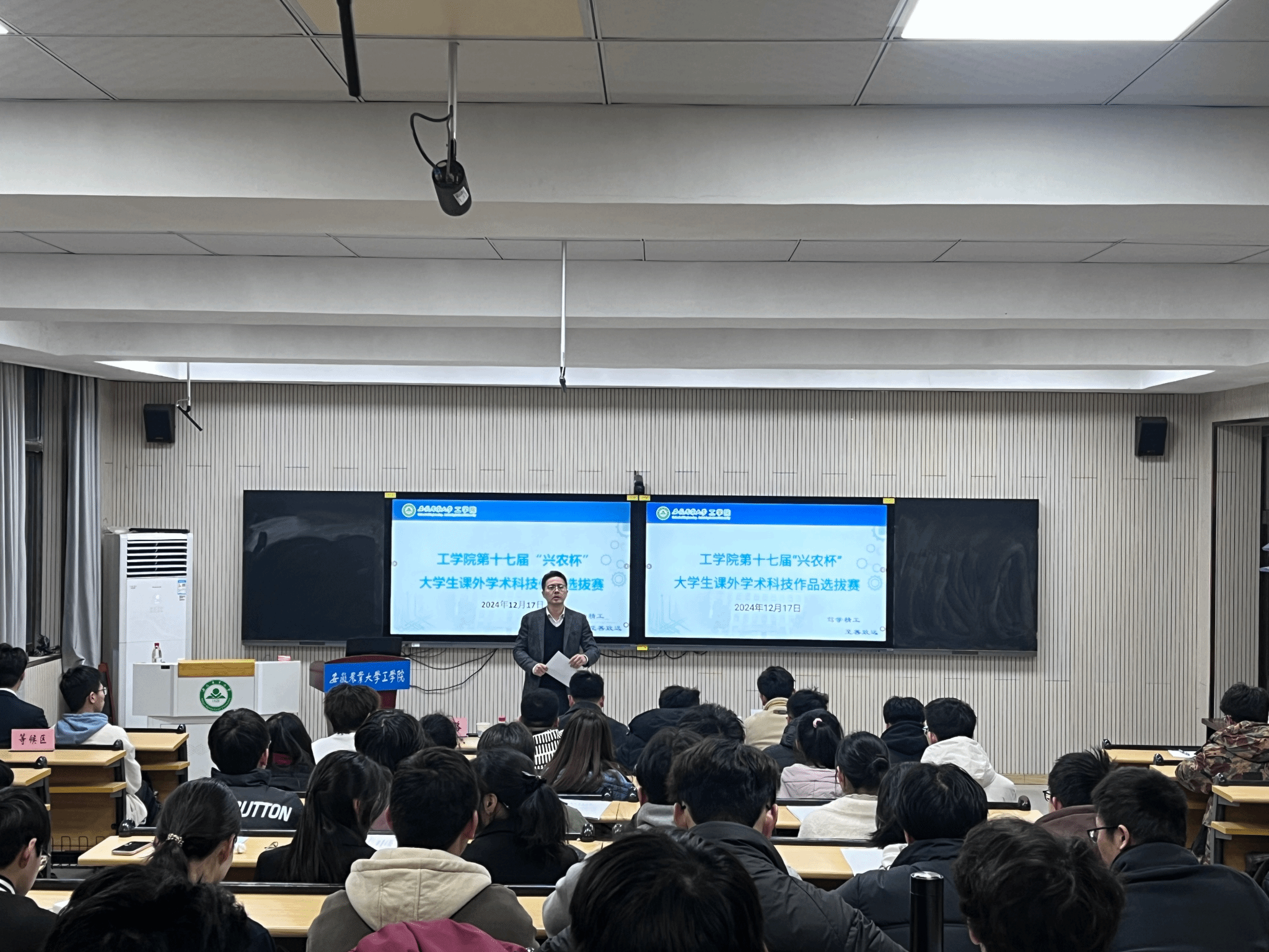 本网讯 12月17日晚,工学院举办第十七届“兴农杯”大学生课外学术科技作品竞赛决赛,校创新创业学院负责老师韩天才、学院兼职团委副书记吴蒙然、学院团委副书记翟施程等担任评委。学院党委副书记张璐出席比赛现场并做动员讲话。
